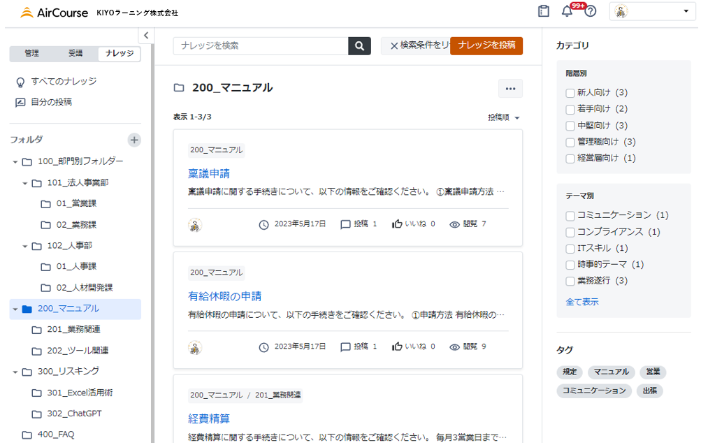 KIYOラーニング株式会社(東京都千代田区、代表取締役社長:綾部貴淑、以下KIYOラーニング)は2023年5月25日より企業向けナレッジマネジメントサービス「AirCourseナレッジ」の提供を開始いたしました。