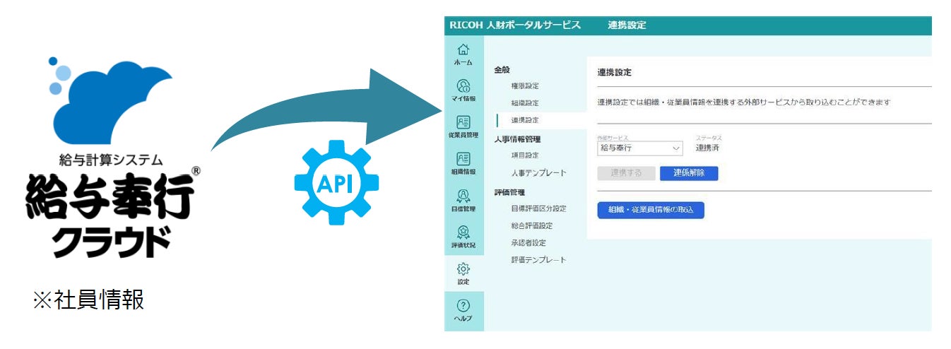 これにより、『給与奉行クラウド』で利用している社員情報や組織情報(部門、組織体系)を『RICOH 人財ポータルサービス』で利用することができ、マスタの二重入力がなくなり効率化を図ることができます。