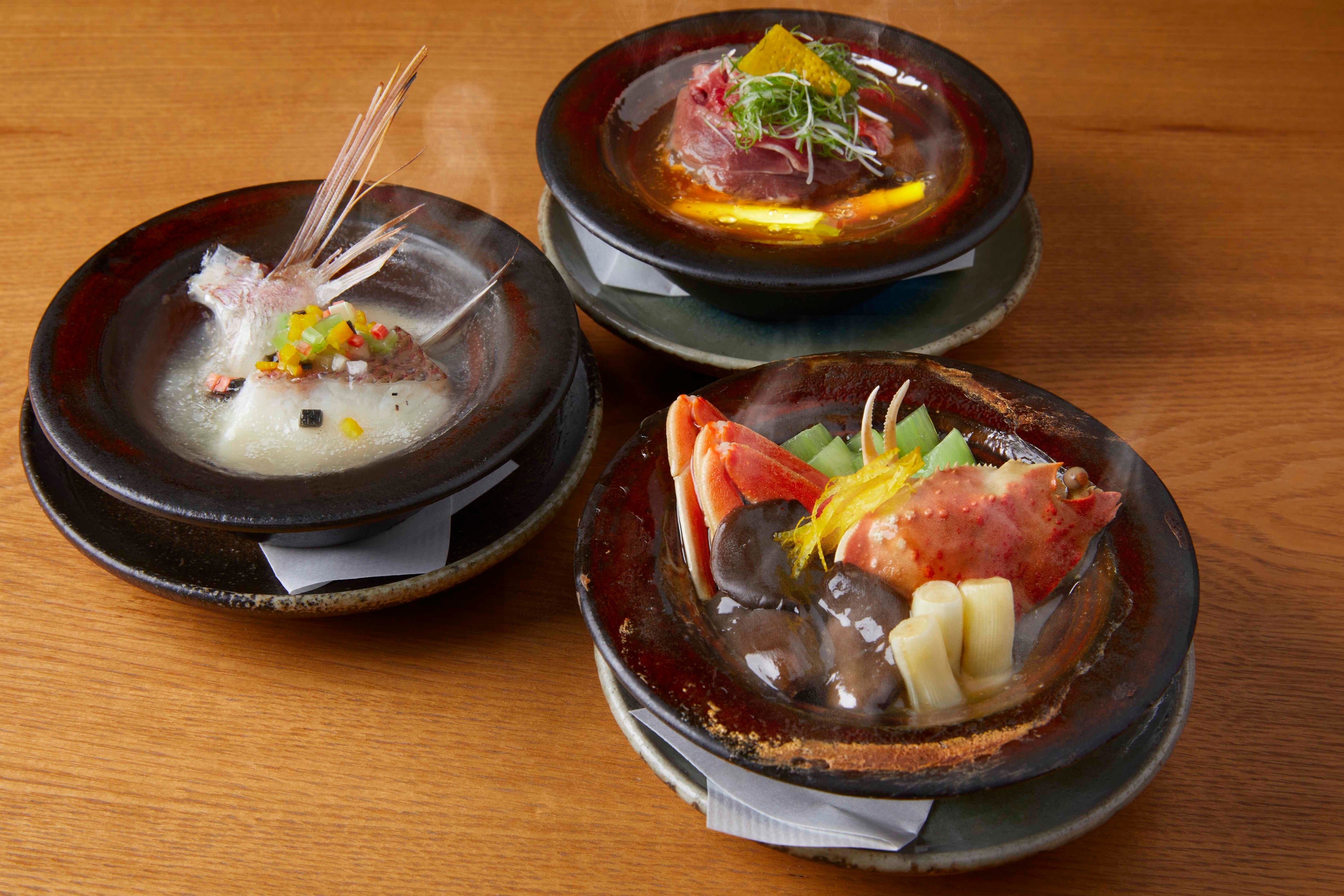 和食と真摯に向き合う京都発の〈宮川町 水簾〉。冬のコースでは、京丹後の香箱ガニや鯛かぶら、十勝ハーブ牛などその日最良の食材を小鍋仕立てに。色とりどりの和食とともに、上品な料理を味わうことができます。もちろん、日本酒との相性も抜群!