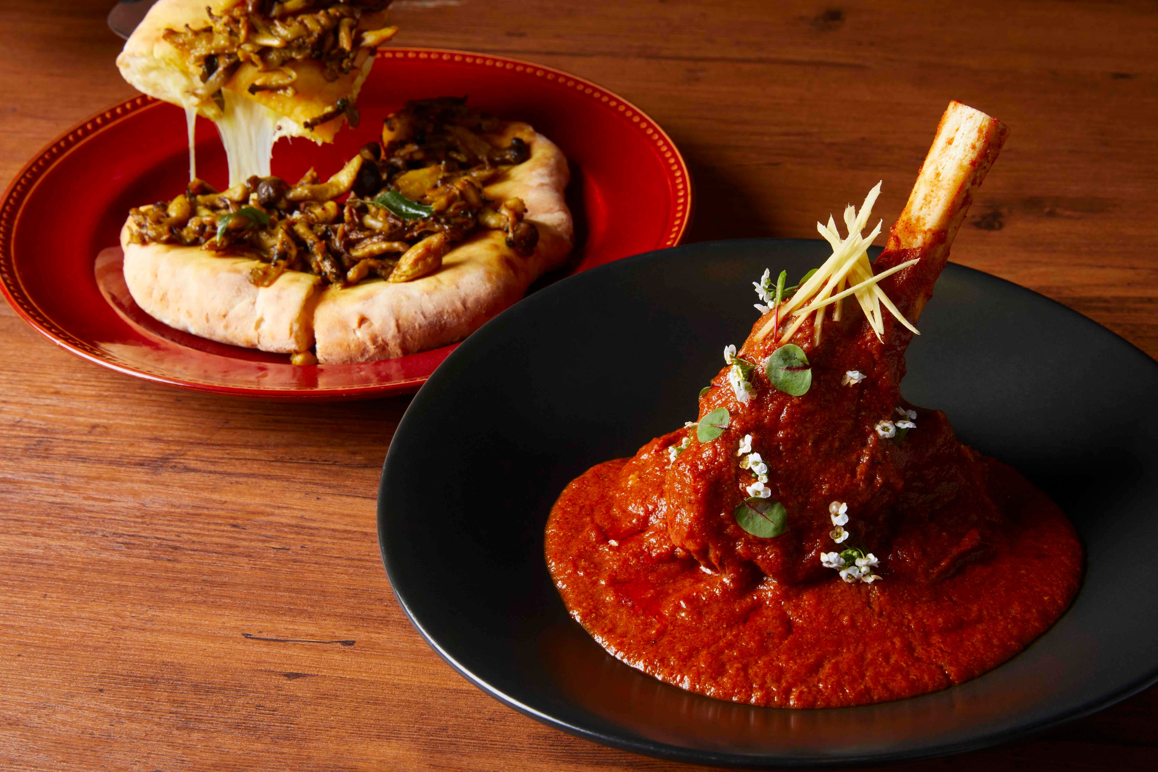 仔羊の骨付きすね肉、野菜、ターメリック、生姜などを煮込んだ、インド・カシミール地方の伝統カレー、ローガンジョシュとマッシュルームやチーズをのせたクルチャをご用意。ホロホロ崩れる柔らかな仔羊と旨味あるクルチャのハーモニーを楽しんで。