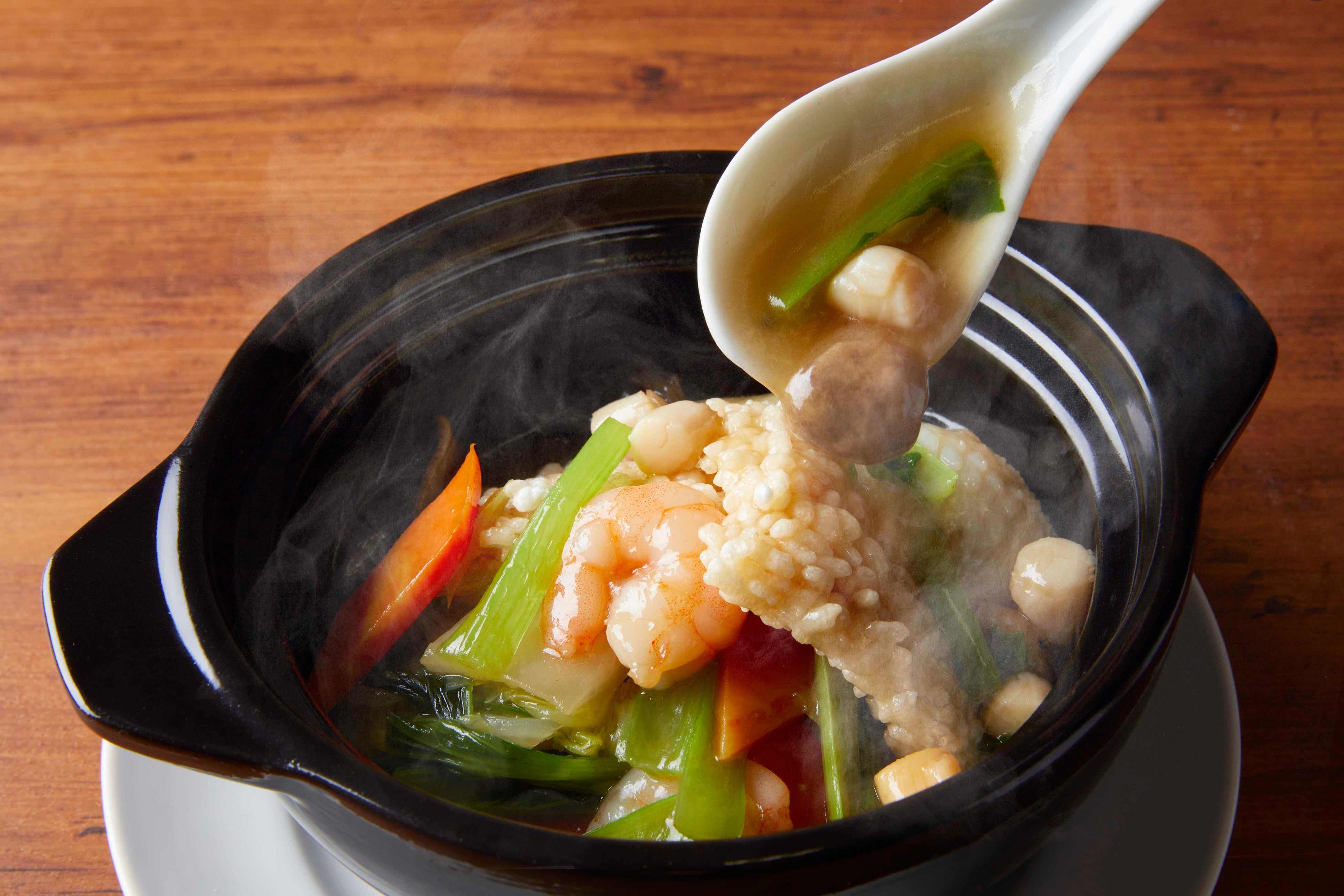 香ばしいおこげにエビやイカなど魚介や野菜がたっぷり入った餡をお客さまの目の前で注いでご提供。パリパリしたおこげにとろりとした餡、シャキシャキの野菜など、目で耳で舌で、五感で楽しめる絶品中華です。ぜひ紹興酒とどうぞ。