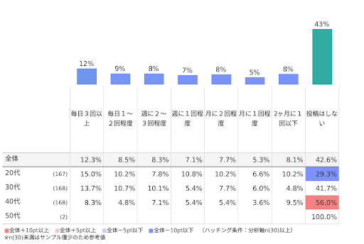 SNSを毎日3回以上見る方が全体の6割を超え、週に1回以上見ると回答した方は全体の93%にのぼります。また、実際に投稿している人は約半数という結果になりました。SNS経由で受け取る情報はフォローしている人、SNS自身のアルゴリズムに影響を受けますが、一部のユーザーによる情報を受け取っていると意識することも大切かもしれません。