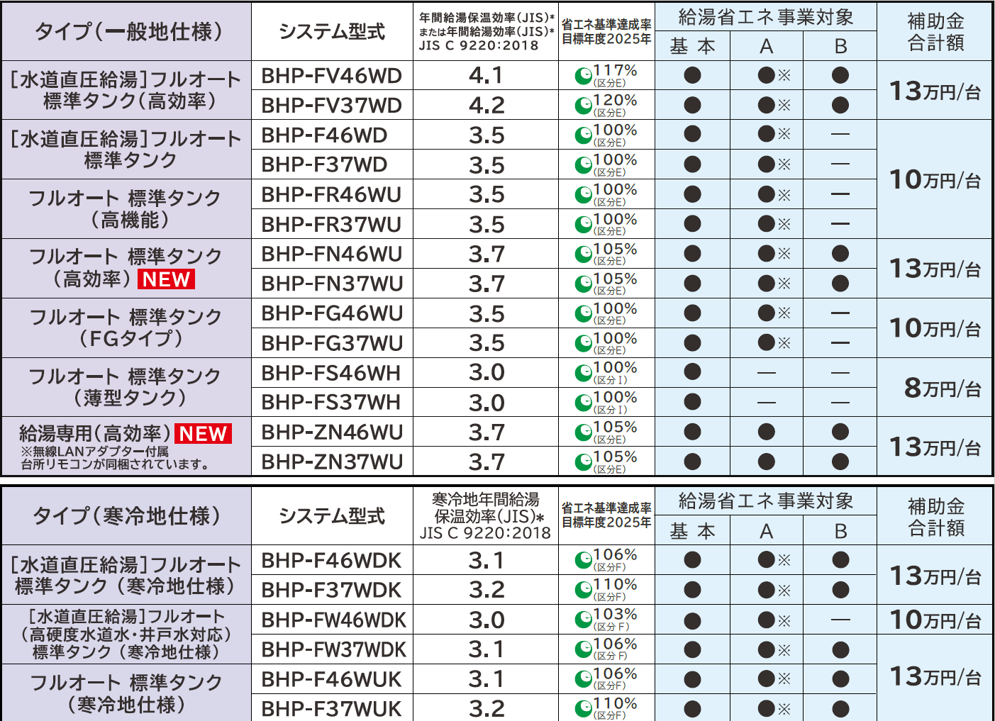 今回発売する4機種では、⾼断熱の「ウレタンク」や効率の高いヒートポンプユニットの採用により、フルオート標準タンク(高効率)2機種で年間給湯保温効率(JIS)3.7 を、給湯専用(高効率)2機種で年間給湯効率(JIS)3.7 をそれぞれ実現し、2025 年度を目標年度とする省エネ基準達成率105%としました。これにより、補助金の性能加算要件B要件の対象となりました。