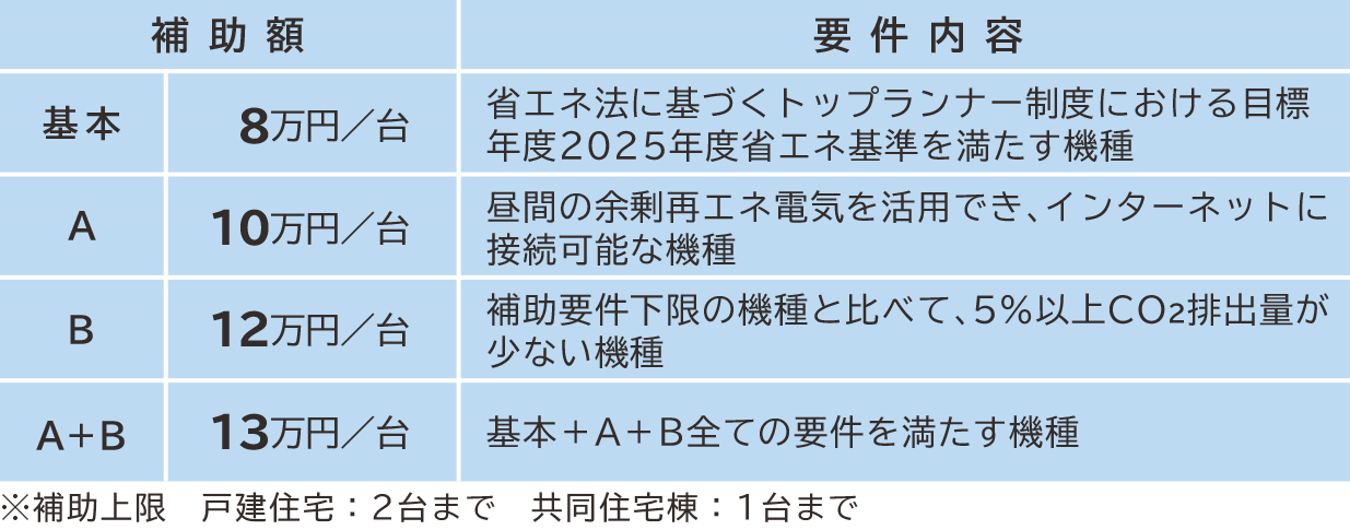 ①基本額:性能要件を満たしたエコキュートに対して定額(8万円)を補助
