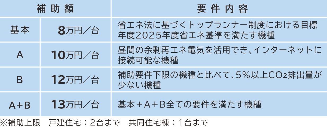②性能加算額:①のエコキュートについて、A~Bの要件を満たす場合、その性能に応じた定額を補助