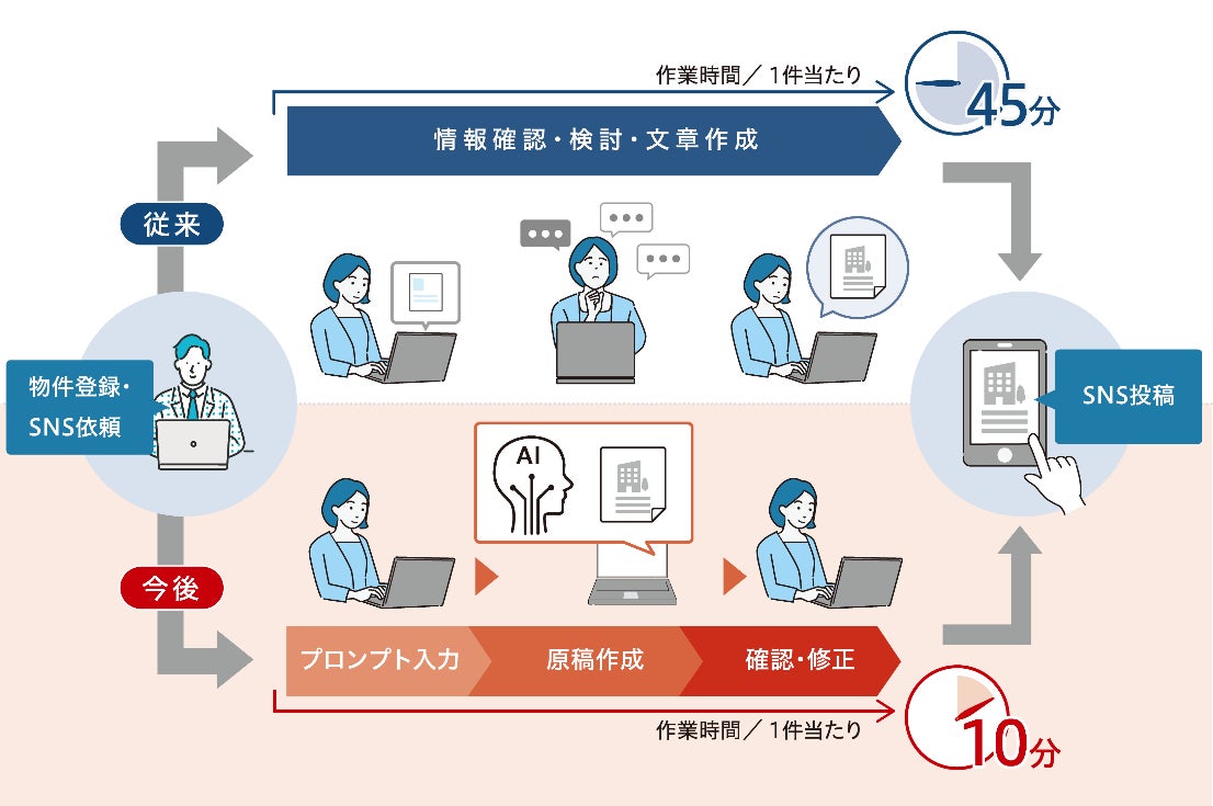 従来、東急リバブルではSNS投稿を専門とする担当者が、営業担当者の要望を受けて、個別に投稿する文章を作成してきたことからSNSへ投稿できる物件の数にも限界があり、一般的な販促手段としてのSNS活用が困難な状況でした。