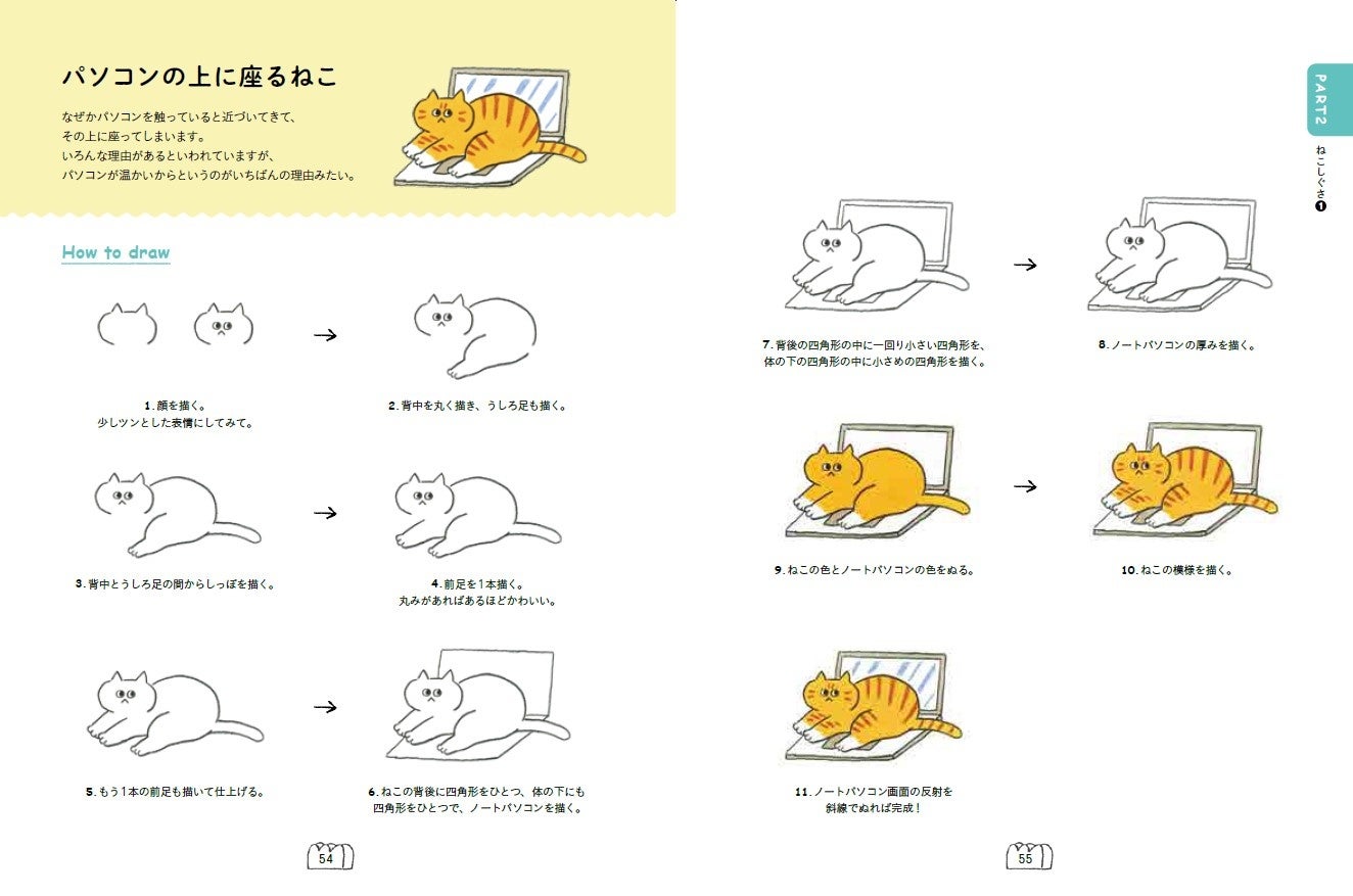しっぽで足を隠すしぐさや、PCの上でくつろぐ姿など、ねこ飼いさんならおなじみのポーズが満載なので、描いてみたくなること間違いなしです。