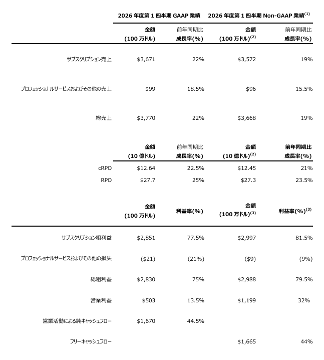 2026年度第1四半期のサブスクリプション売上高は36.71億ドル、前年同期比22%増、為替変動の影響を除いた場合は19%増