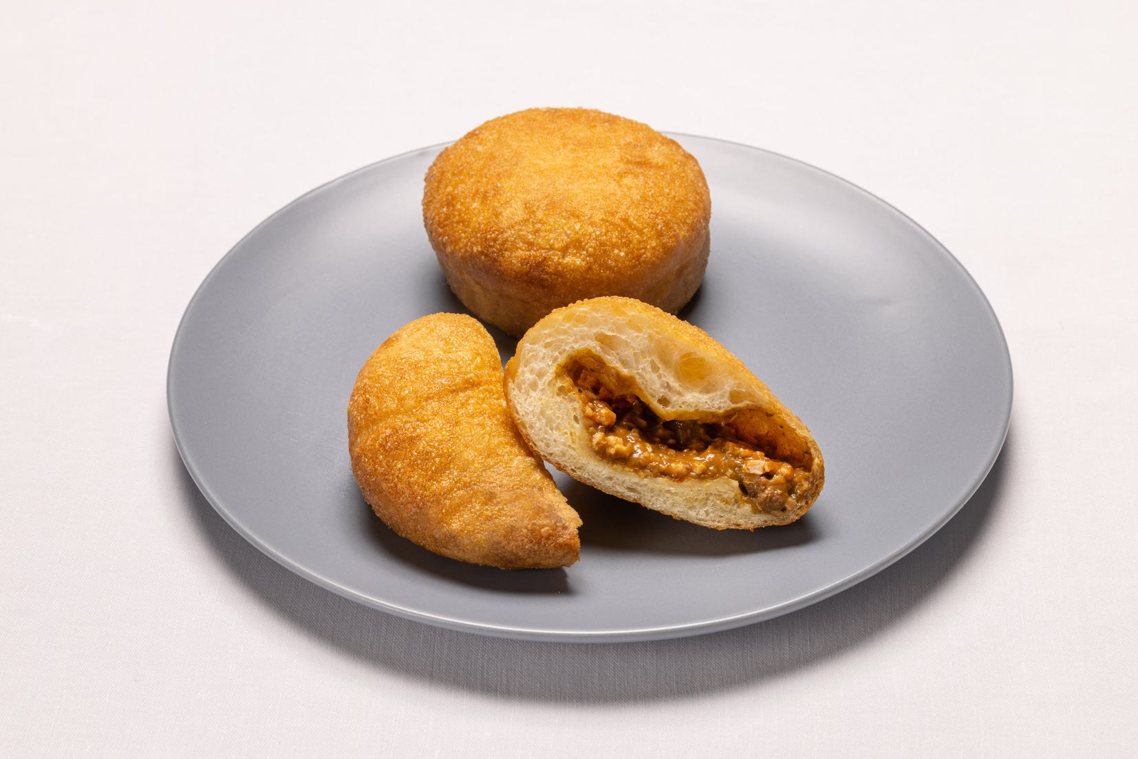 鶏ひき肉や砕いた豆をトマトベースのチリソースで煮込んだチリソース風のカレーを、薄めに伸ばしたチャバタ生地で包み揚げたメキシカンなカレーパンです。