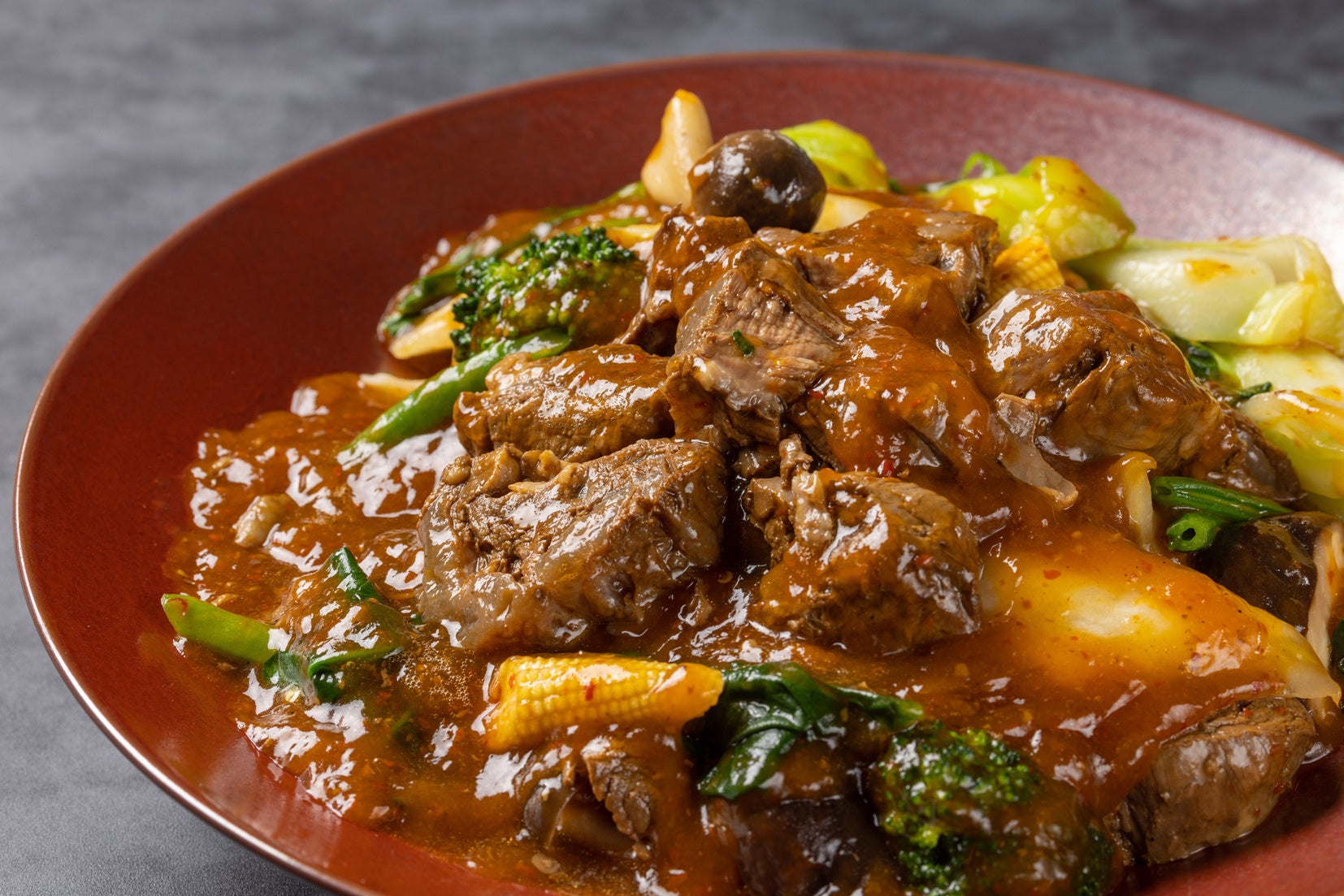 国産の牛スジ、ヤングコーン、ブロッコリー、広東白菜など9種類の野菜を自家製の麻辣醤で煮込んだ特製スープでいただく刀削麺です。さまざまな具材を入れて2時間煮込んだ、麻辣醤が麺とよく絡み、あと引く辛さが癖になる一品です。