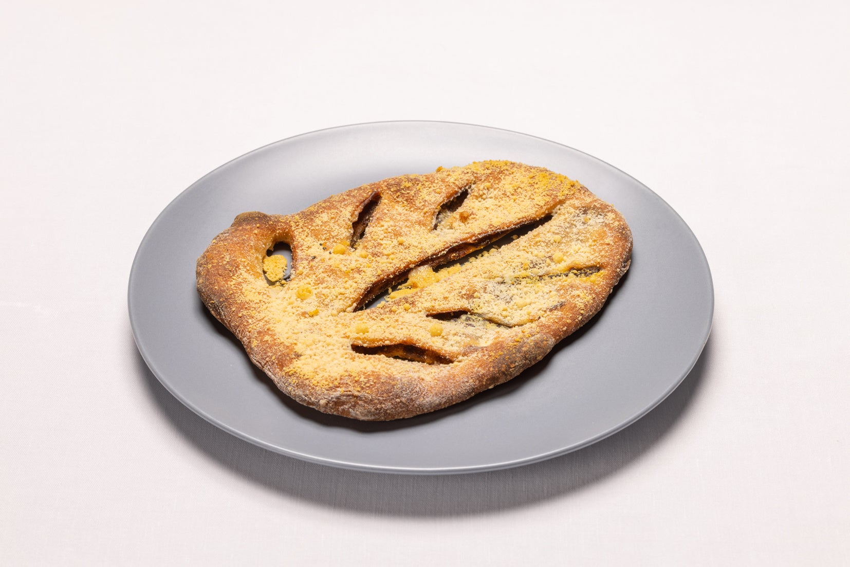 大きな葉のような形にしたフランスパン生地に、辛口のカレーを忍ばせました。生地の表面にまぶされたパルメザンチーズも香ばしくカリカリに焼き上がり、少量ずつちぎって噛みしめながらお楽しみいただきたい、おつまみにピッタリのカレーパンです。