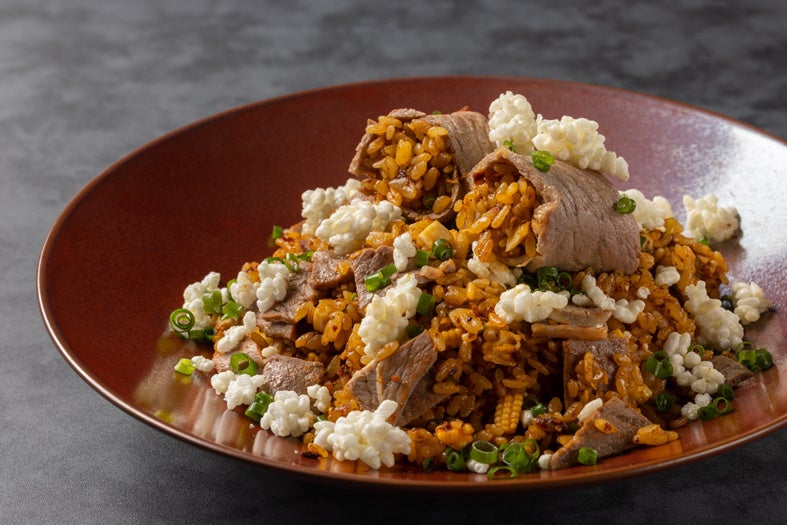 エリンギ、葉ニンニク、ヤングコーンが入った麻婆醤炒飯を、ハーブ牛サーロインで巻いてご提供いたします。上にはおこげをまぶしており、食感と香ばしさが味のアクセントになって、食べ飽きない一品です。