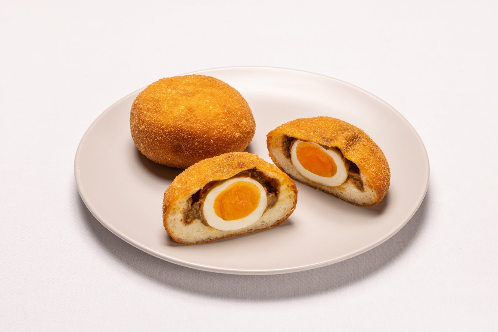 毎夏楽しみにしてくださっているファンも多い、ゆで卵を丸々一個つかったインパクトと食べ応えのあるカレーパンです。甘みのあるミルクロール生地で卵とカレーを包み揚げました。スパイシーなカレーをミルクロールと卵がマイルドにしてくれ辛さが苦手な方にもご好評です。
