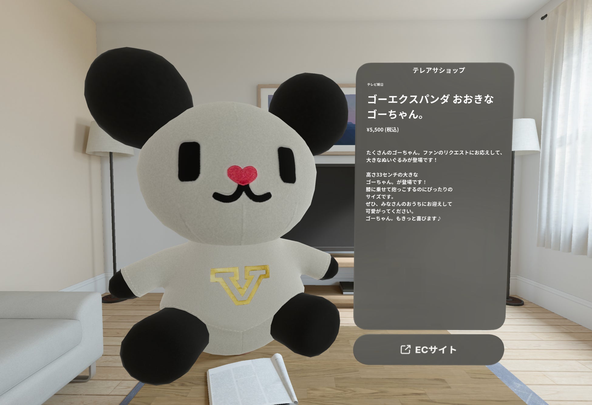 バーチャル店舗内にはテレビ朝日の番組などに関連したバッグやシューズ、ぬいぐるみなど様々な商品を配置しており、商品を手で摘まむジェスチャーをすると、商品が実物大で表示され、サイズ感や質感、部屋に設置したイメージなどを体感することができます。ECサイトに遷移し、そのまま購入することも可能です。