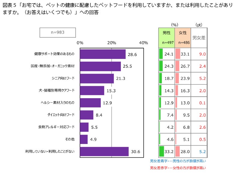 犬に限らずペットを飼っている人に、ペットの健康に配慮したペットフードを利用してるか、利用したことがあるかを聞くと(図表5)、「利用していない・使用したことがない」人が30.6%でした。