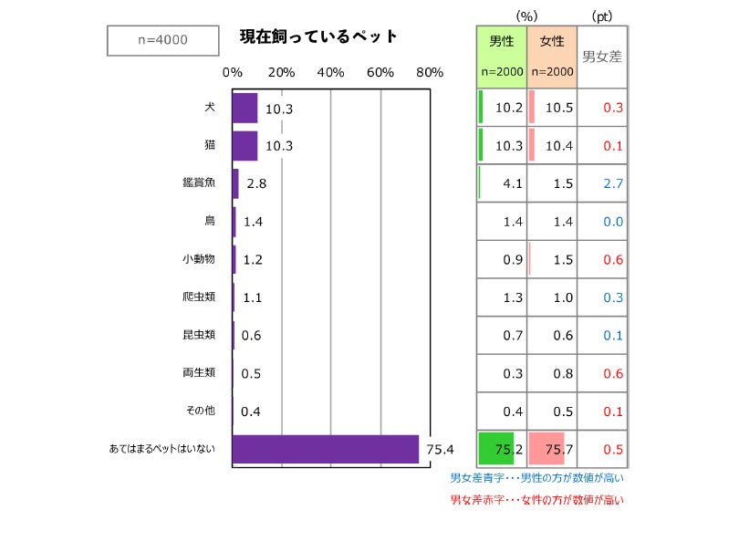 「ペット」と聞いて、最初に思い浮かべるペット、現在飼っていないが、過去に飼ったことがあるペットについては、どちらも犬のほうが猫より割合が高くなっていますが、現在飼っているペットについては、犬も猫も、どちらも10.3%と同じ割合になりました。