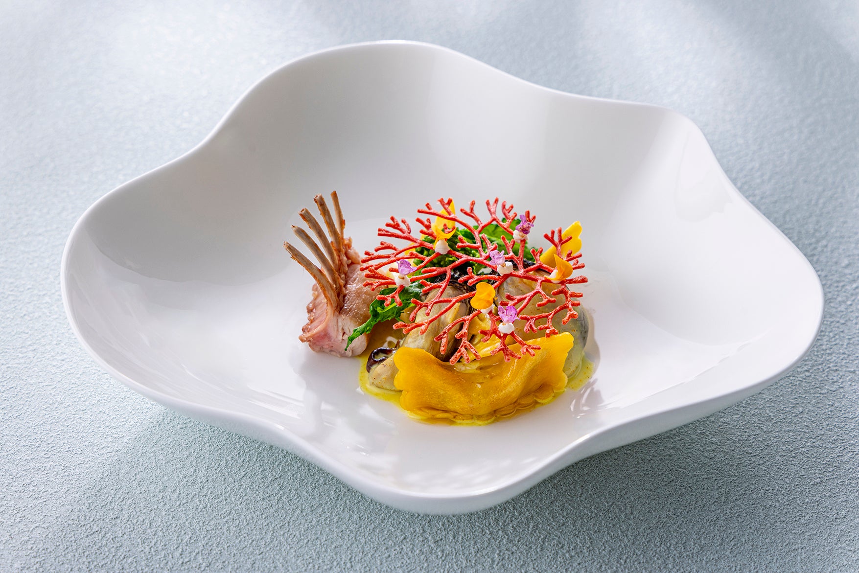 濃厚な味わいと大きな身を誇る三陸産の牡蠣と、日本最高級として知られる黒毛和牛のいわて牛を使用した、三陸の豊かな自然が生んだ食材をご堪能いただけるコース。コンソメスープや鉄板焼など、異なる調理法や食材を組み合わせることで、素材の持つ可能性を引き出します。