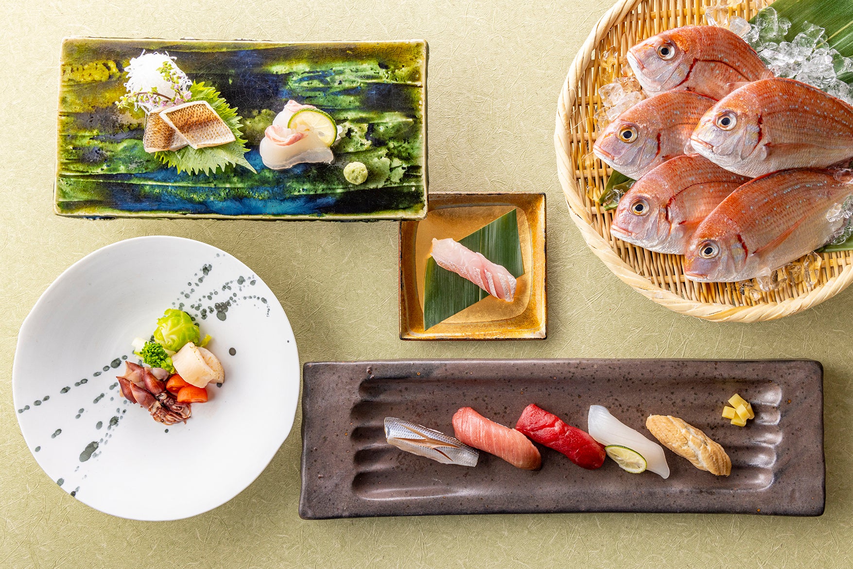 四季の味覚を存分に堪能できる本格的な日本料理が魅力の「風花(かざはな)」では、レストランが擁する会席、鮨、鉄板焼それぞれから季節限定のメニューをご提供します。会席からは、旬の食材をふんだんに使用した箱弁当と海鮮バラちらしがセットになった、見た目にも美しい「箱弁当 桜花(おうか)」を、鮨カウンターからは富山県産ホタルイカと千葉県産春子鯛(かすごだい)を味わう「春のおまかせ鮨コース」を、そして鉄板焼カウンターからは牡蠣やいわて牛など三陸の食材をご堪能いただく「三陸牡蠣といわて牛の鉄板焼コース」をご提供します。