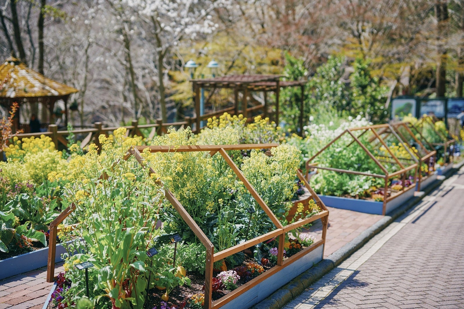 ミモザの向かい側には、野菜とハーブのお洒落で実用的なアイデアが満載の「家庭菜園ポタジェ」がカラフルに彩ります。主役のミモザを満喫した後は、様々な野菜をお楽しみください