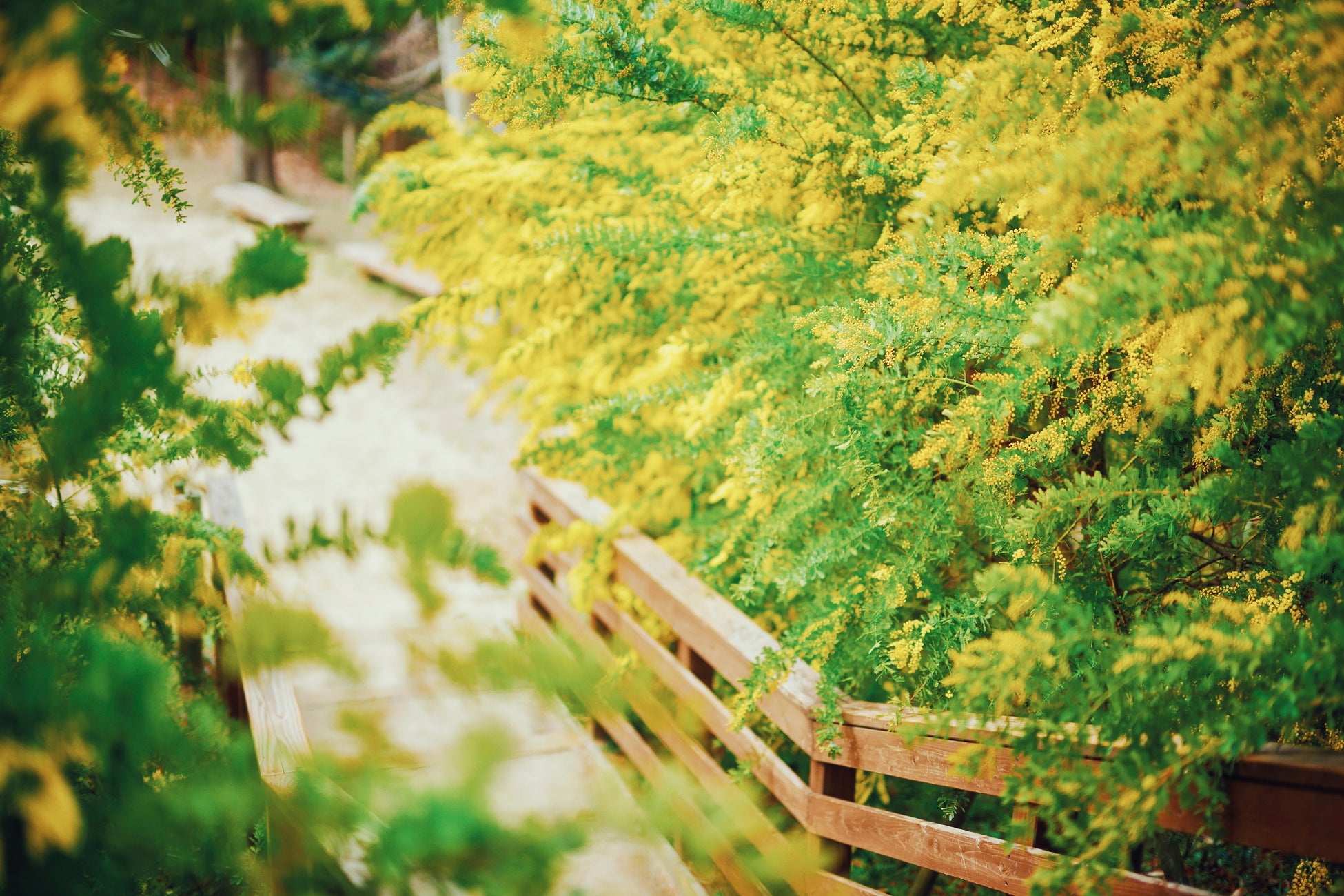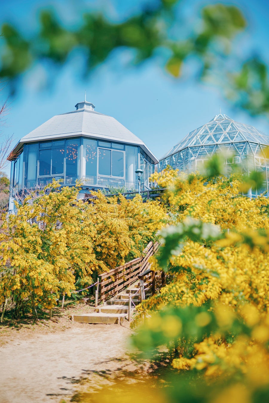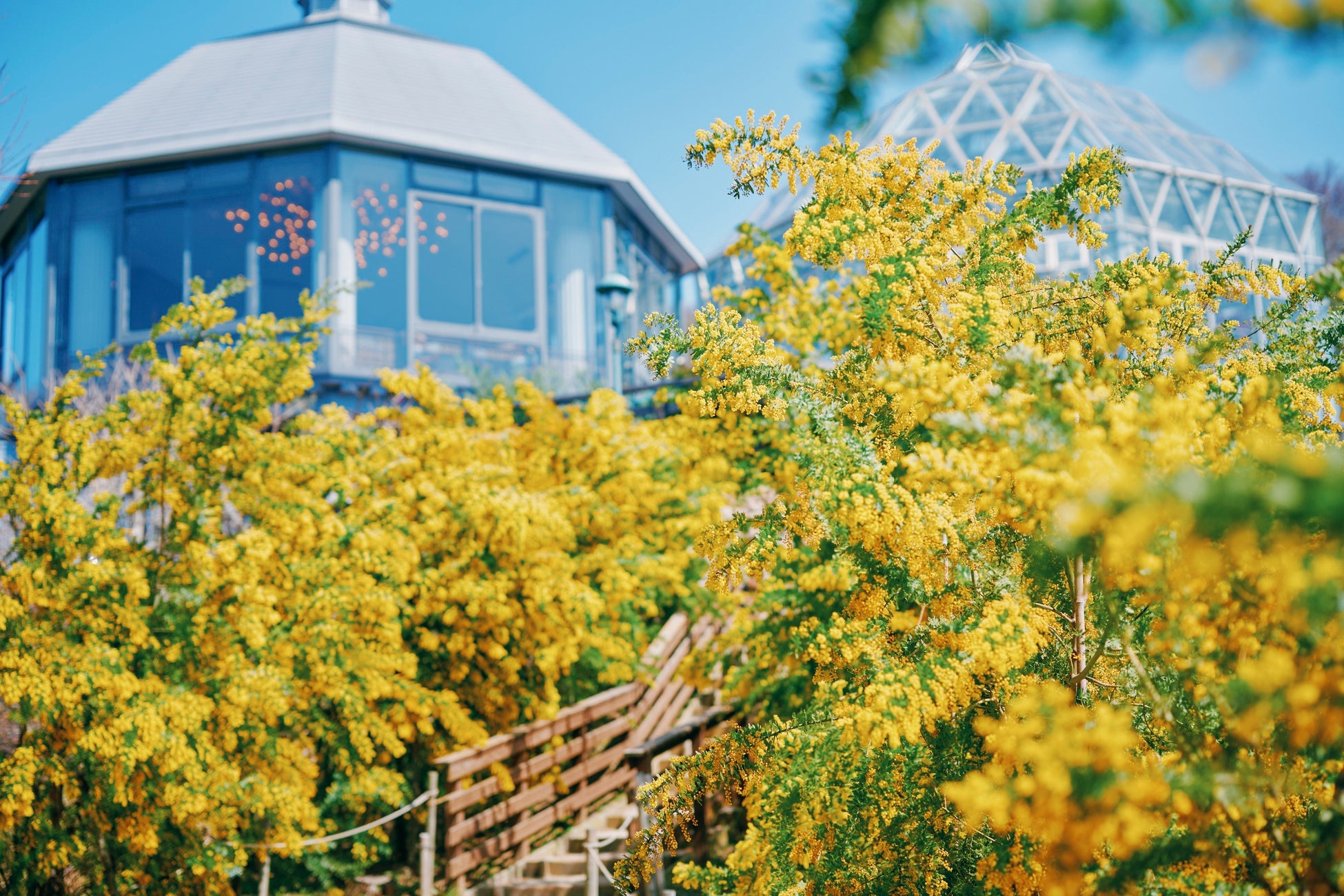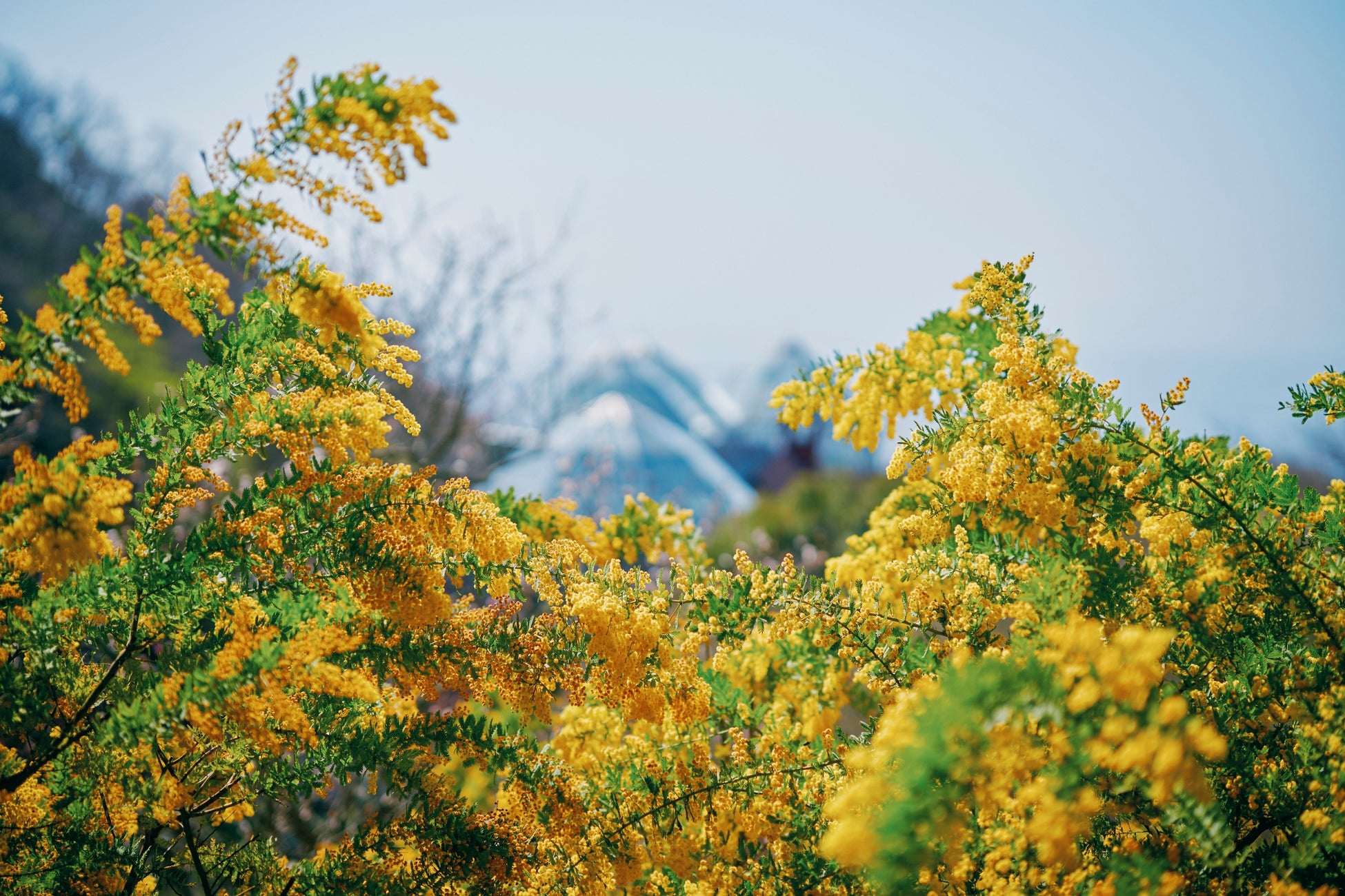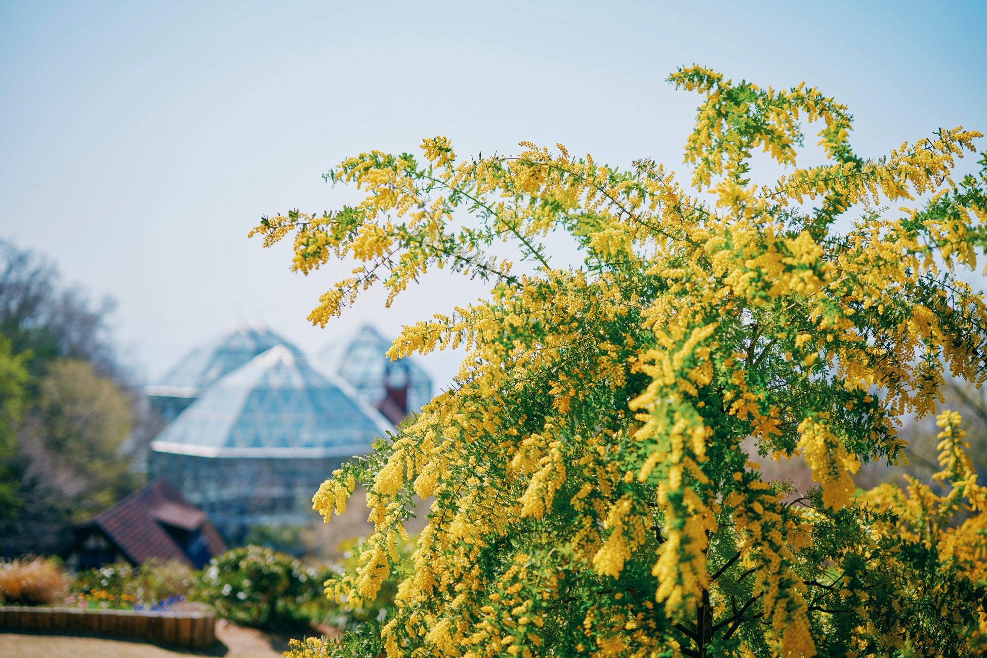 間もなくミモザが見ごろを迎えます。神戸布引ハーブ園では、2つのエリアで黄色に輝くミモザをお楽しみいただけます
