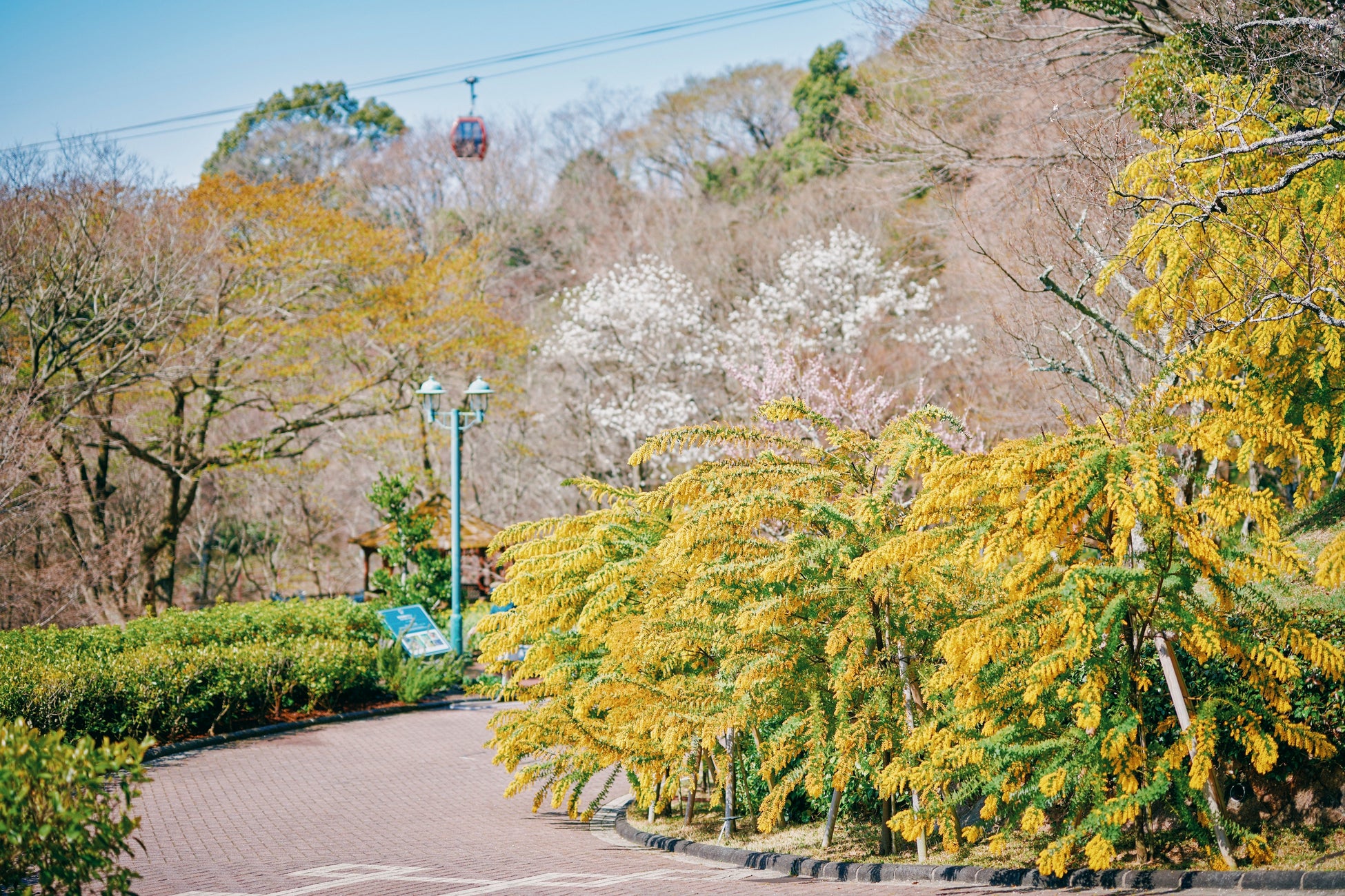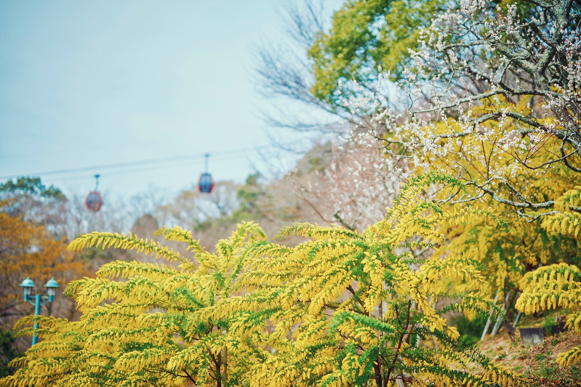 園路沿いを黄色に染めるミモザを散策しながら間近でお楽しみいただけます。背景にロープウェイが入る「神戸布引ハーブ園」ならではのフォトスポットです