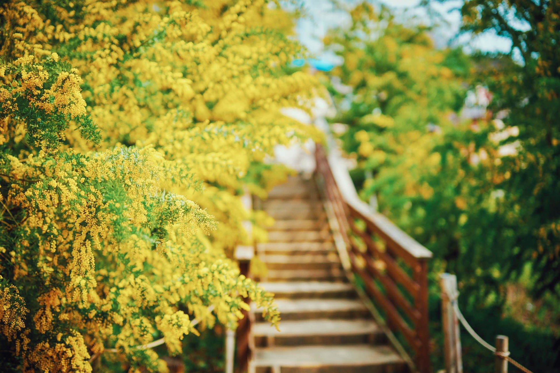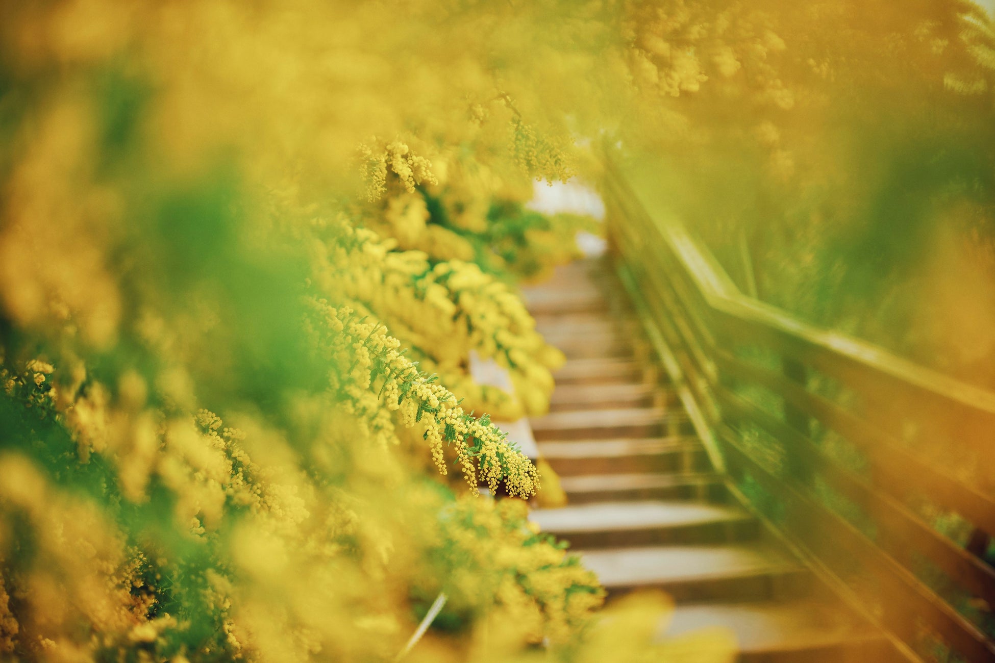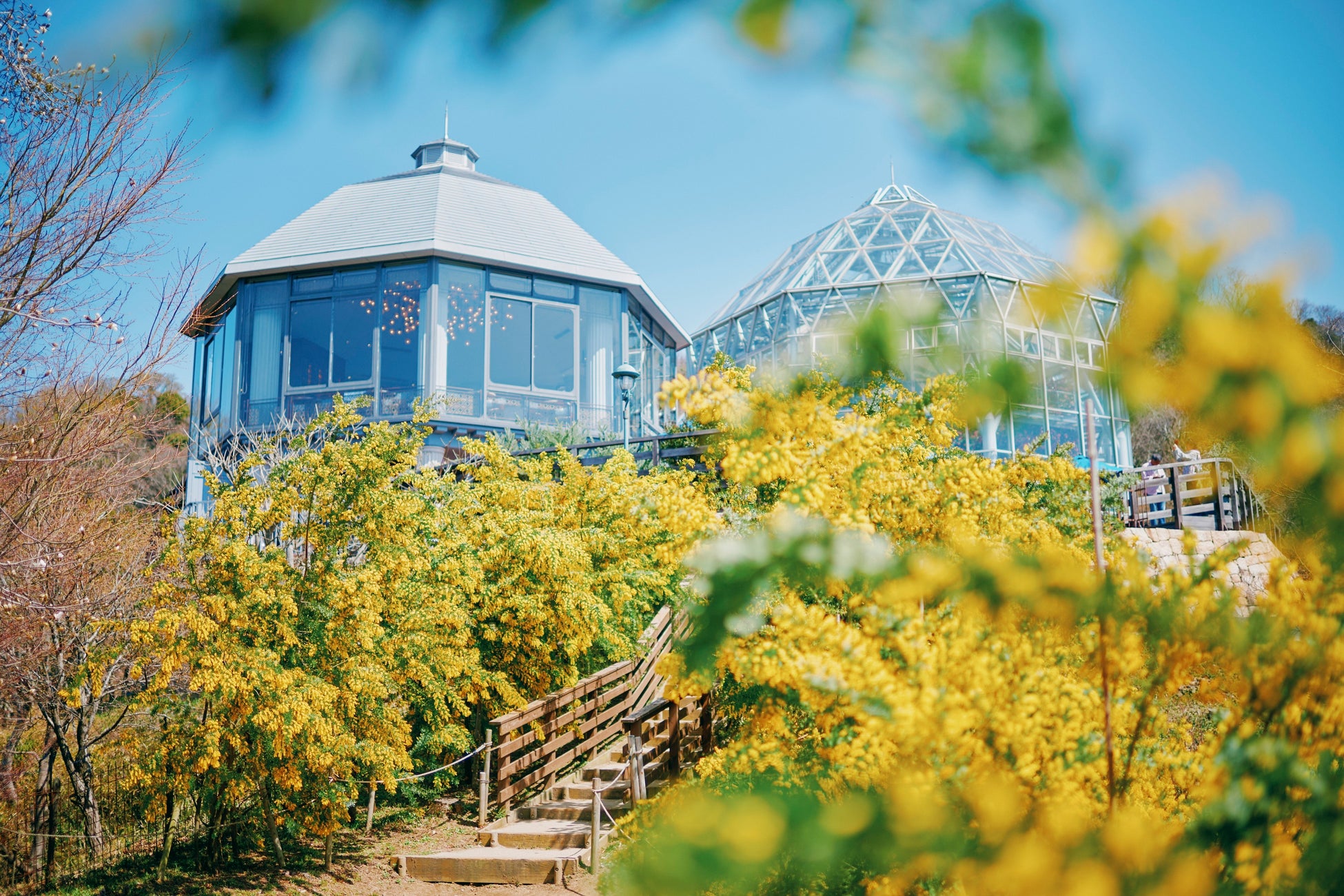 ザ・ヴェランダ神戸の1Fテラスからは、神戸の景色を背景に春風に揺れる優雅なミモザを。テラスを奥に進むとミモザに囲まれる、幻想的な階段が登場します