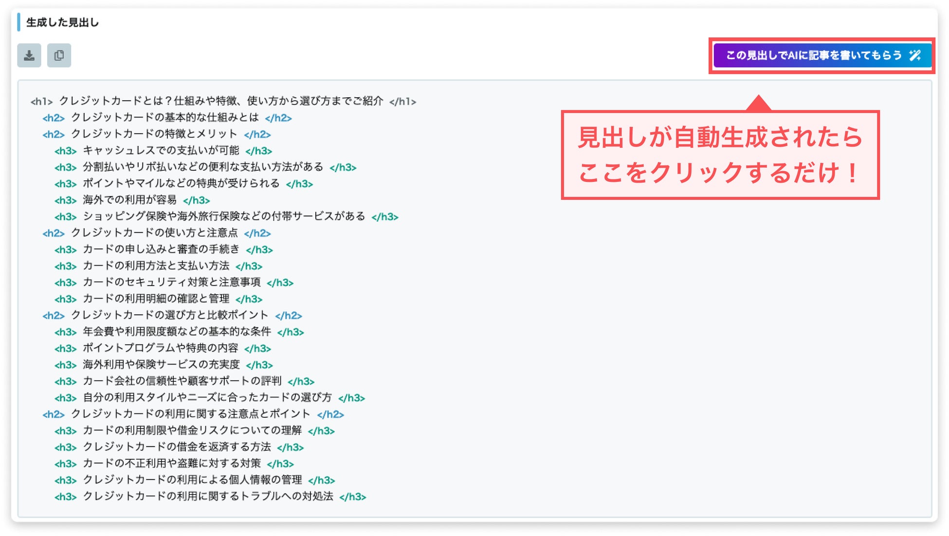見出し自動生成後は、ワンクリックで記事の自動生成機能をご利用いただけます。