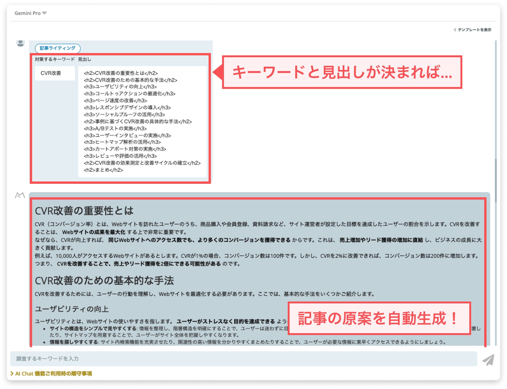 狙っているキーワードと記事の見出しを入力するだけで、自動的に記事の原案を生成できます。これにより、記事作成の工数を大幅に削減し、効率的なコンテンツ制作が可能となります。