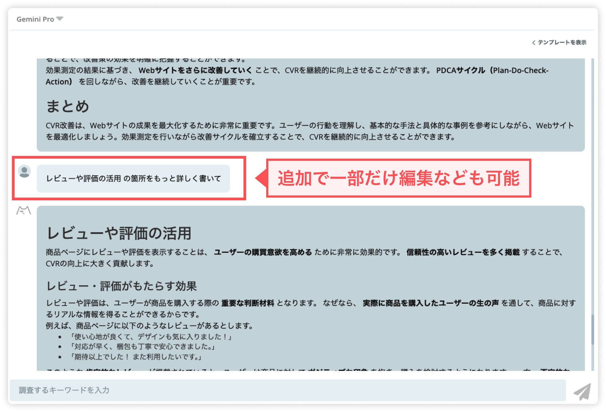 チャット形式での追加指示が可能なため、出力内容に対して一部の書き直しやブラッシュアップもAIに依頼することができます。