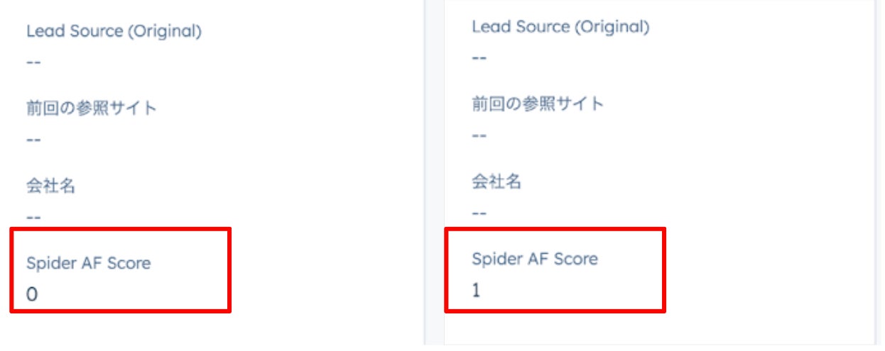 数分以内にリードのSpider AF ScoreがHubSpotに反映。不正リードの判定結果が自動的にフラグ付けされます。