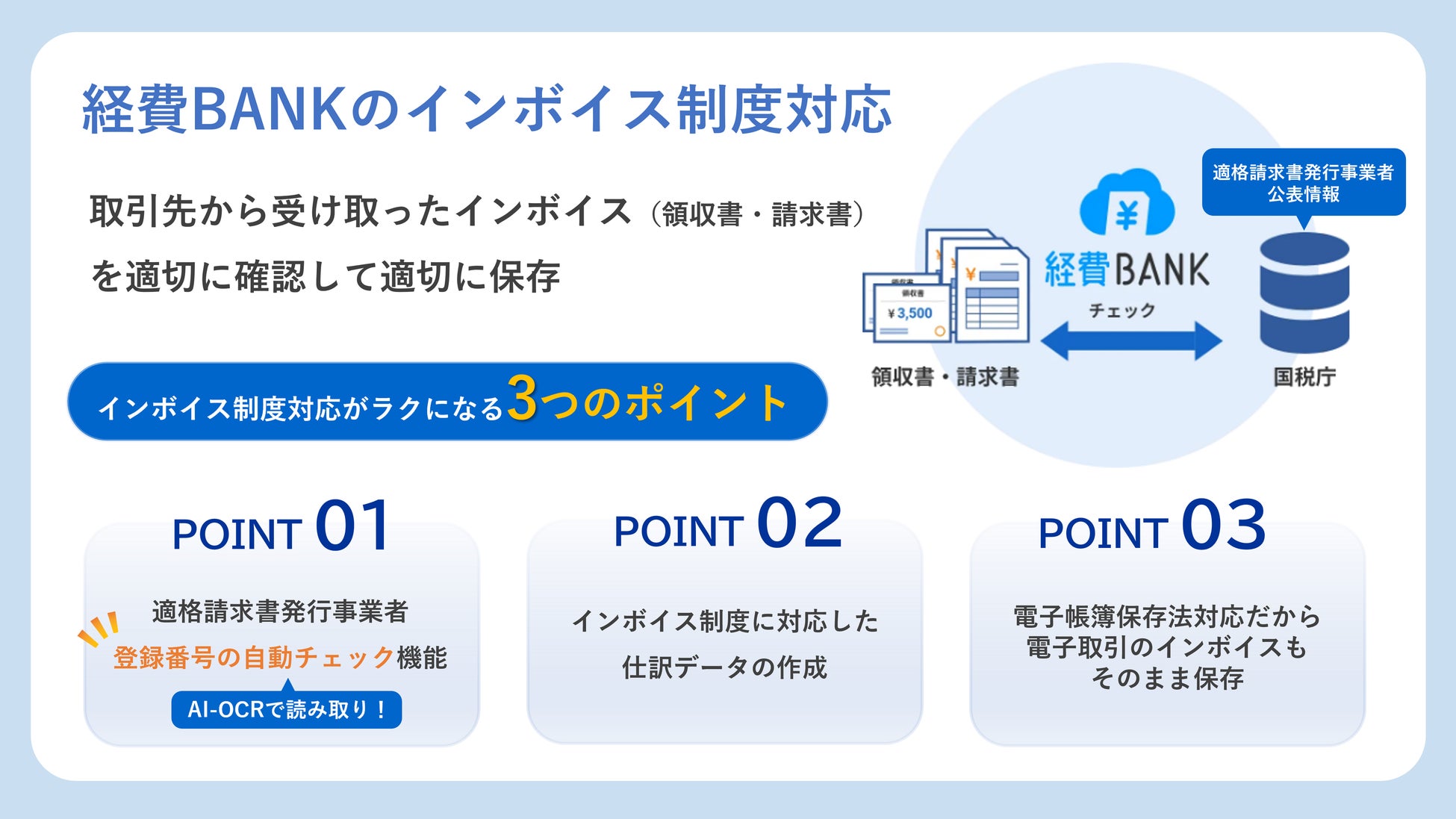 「経費BANK」は、取引先から受け取った領収書・請求書など「インボイス」の事業者登録番号をAI-OCRが読み取り、自動でチェックできる機能を搭載しているため、登録番号確認の作業負担を大幅に軽減できます。さらに会社の運用に沿って消費税区分を設定し、仕入税額控除の対象を区別した仕訳を作成して会計ソフトに連携することができるため、インボイス制度に沿った会計処理が、免税事業者取引時の経過措置まで含めて対応でき、法対応の事務負担を大きく軽減します。