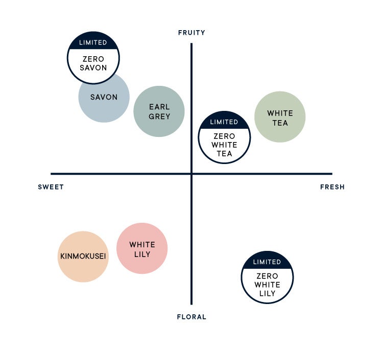 ベルガモットやペアーの果実感をアクセントに、甘さのあるフローラルをプラスすることでリニューアル前のホワイトティーの香料に奥行きが生まれました。ラストのやわらかなウッディの香りが、シトラスとフルーティーフローラルを穏やかに引き立てて、どんなときの気分にも寄り添ってくれる香りです。