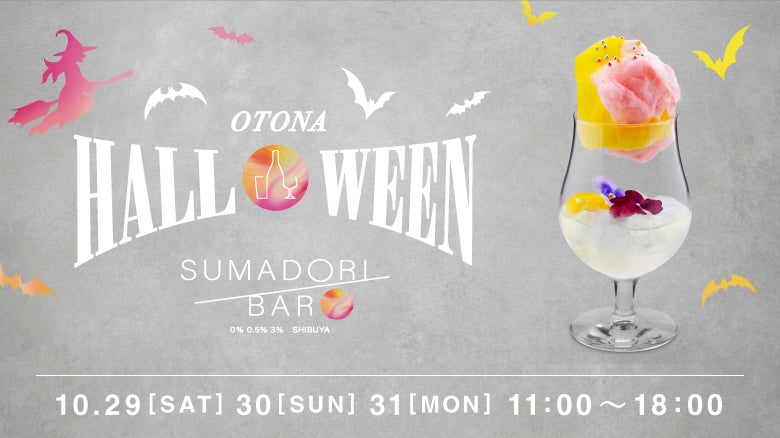 適正飲酒の啓発や飲酒マナーの向上を共通の目的として、バーチャルハロウィーンと連携します。「ノンアルカクテルで気分をきがえよう!」をコンセプトに、昼間は「SUMADORI-BAR SHIBUYA」でオトナハロウィンを楽しもう!味はもちろん、見た目にも楽しいカクテルたちがあなたをいつもとちょっと違う気分に誘ってくれます。なりたい気分で選べるノンアルカクテルメニューをご用意しており、ドリンクが誘ってくれる気分を表現した限定オリジナルステッカーをプレゼントいたします。