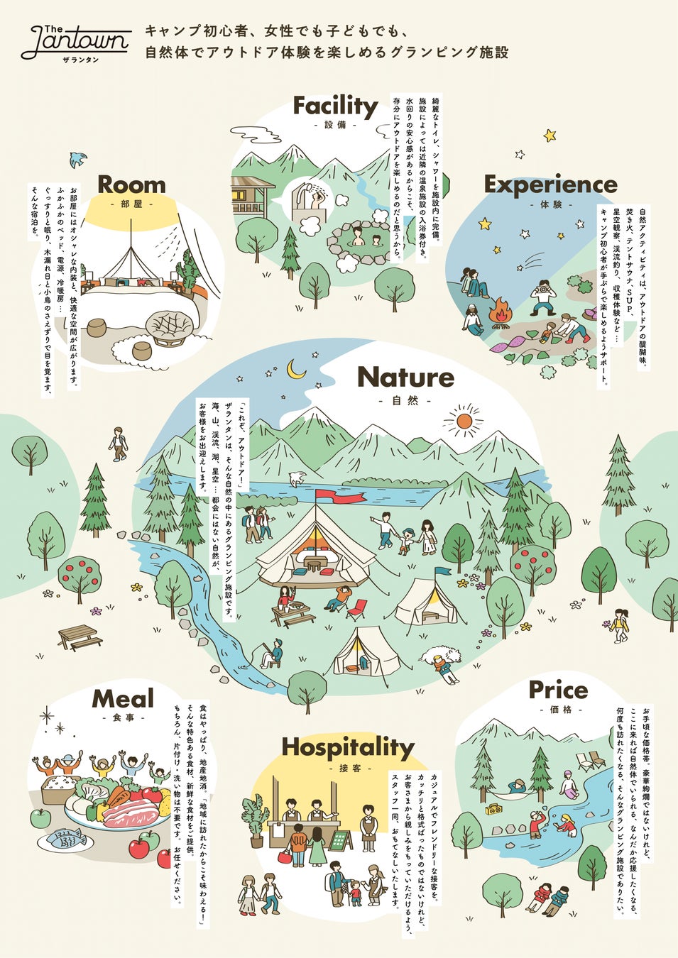 『キャンプ初心者、女性でも子どもでも、自然体でアウトドア体験を楽しめるグランピング施設』というコンセプトのもと、水回りの清潔さや、地産地消の食事など「ちょっとずつのこだわり」を、施設の随所にちりばめた企画・運営を行っています。