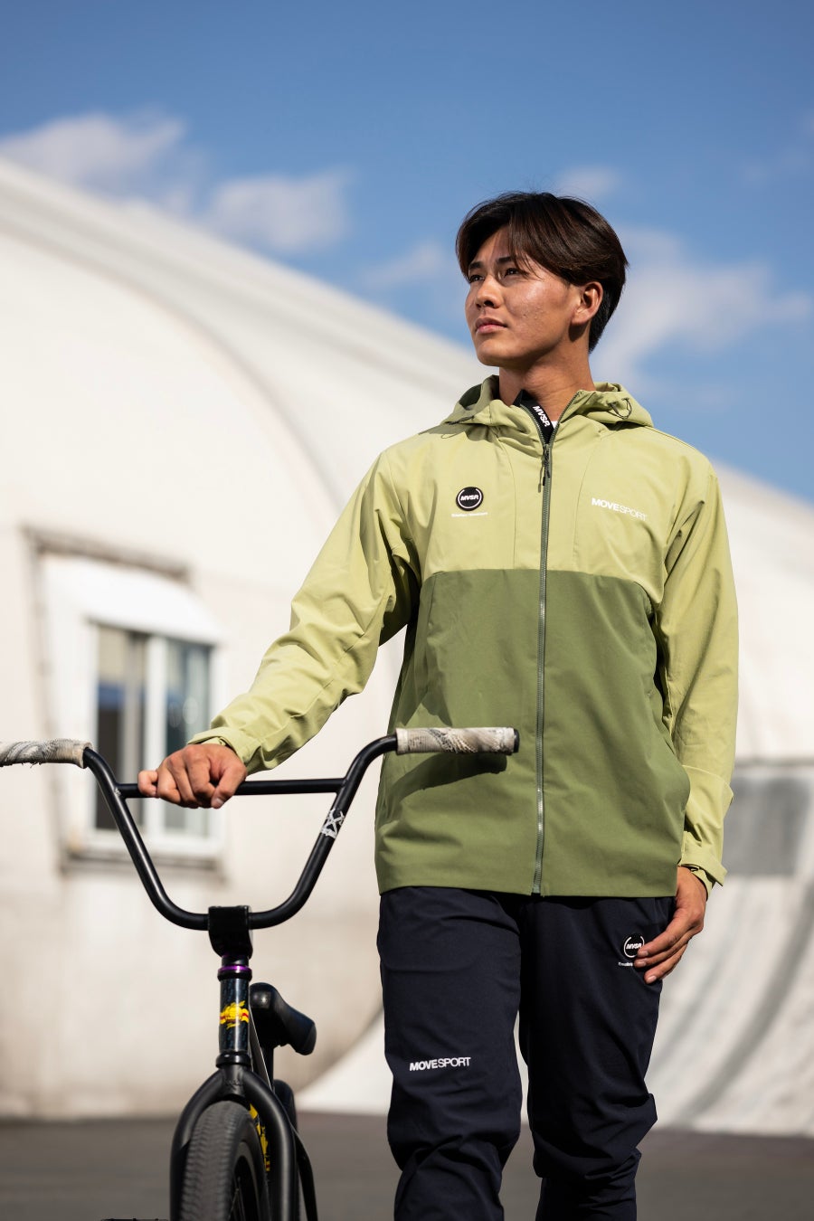 今回、MOVESPORTが僕たちに力を貸してくれたということで、一緒にこのレーベルを盛り上げていきたいです。BMXにとどまらず、今持っている自分の技術や力を駆使して、色んなことに挑戦していきたい。普段、BMXでは、Tシャツとジーンズというスタイルがメインで、硬めの素材が多いので、柔らかいジャージ素材のものは、とても新鮮です。これからは、こういったジャージ素材で、カッコいいBMXのアパレルを一緒に提案してみたいです。