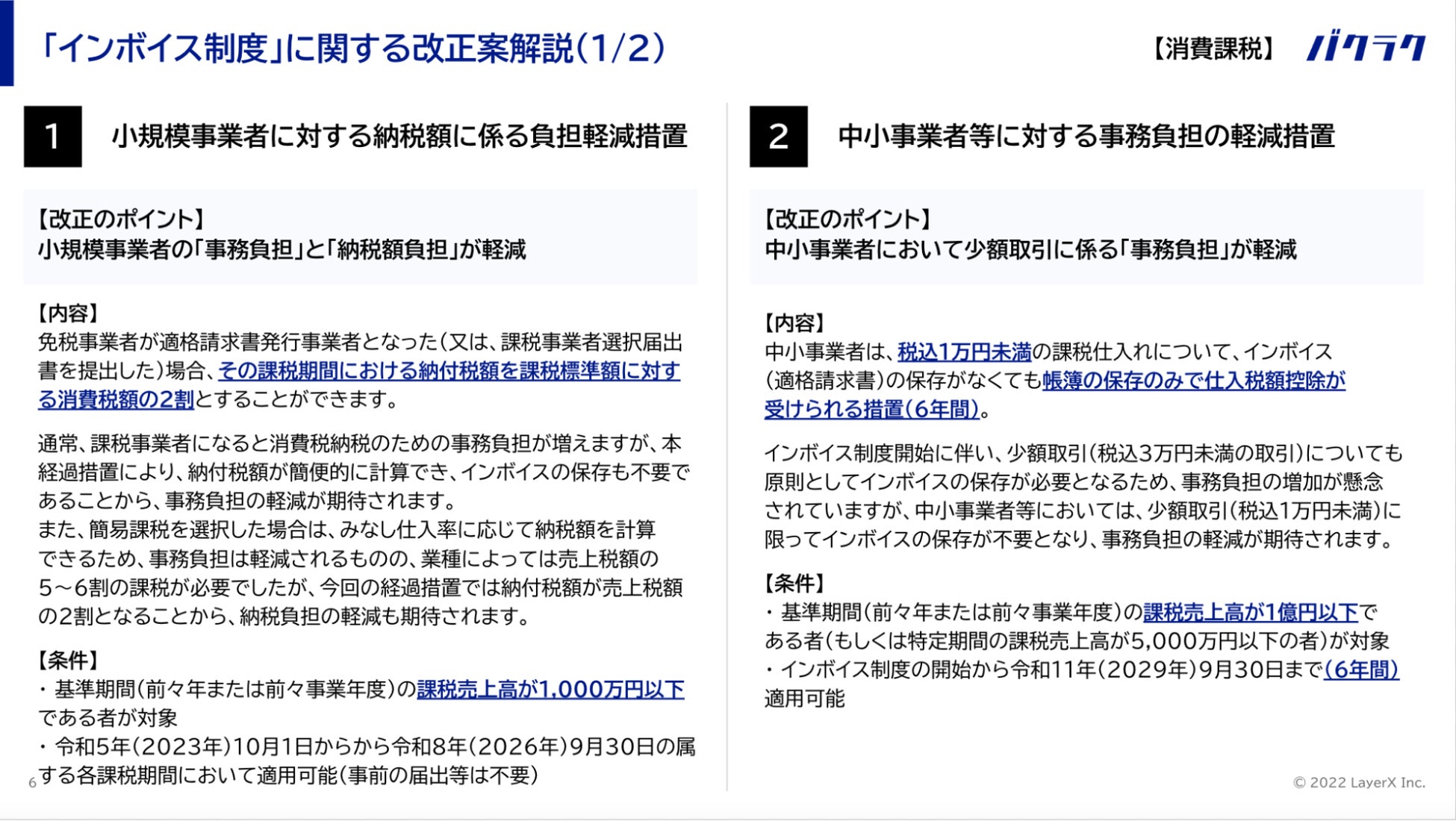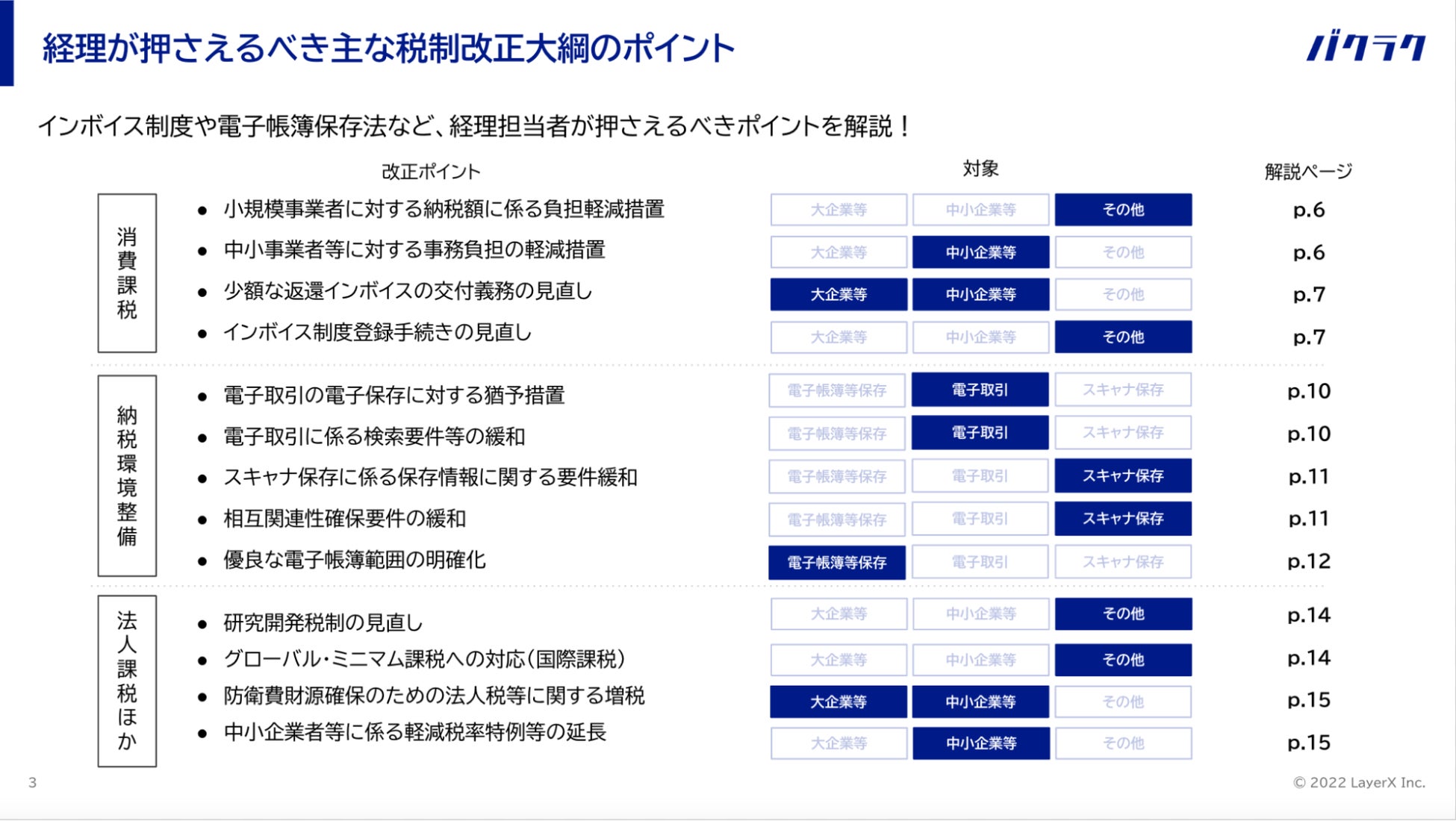 すべての経済活動のデジタル化を目指す株式会社LayerXは、2022年12月16日に発表された「令和5年度税制改正大綱」を受け、支出管理をなめらかに一本化するサービス「バクラク」において、経理担当者が押さえておくべきポイントを解説した資料を公開しました。