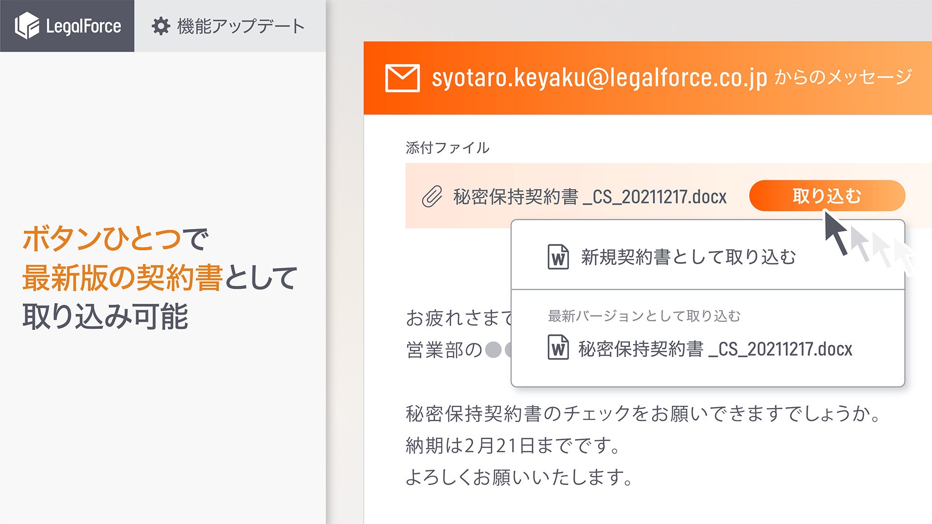契約業務では、事業部と法務部、事業部と契約相手の間で契約書のやり取りが複数回発生するため、バージョン管理が煩雑となります。今回のアップデートにより、「案件管理」機能の案件詳細画面より、メールに添付されている契約書をワンクリックで取り込み、最新版としてバージョン管理することができるようになりました。これにより、バージョン管理にかかる工数やミスなどを削減することができるようになります。