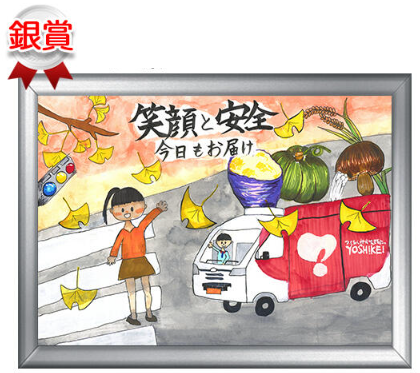 ヨシケイをご利用いただいているご家庭に、ヨシケイの配達車両である「スマイリー号と交通安全」を題材としたポスター作品の募集を行い、339名の方からご応募いただきました。その中から審査員(水彩連盟 運営委員 太田昭氏)による選考審査を経て、60点の入賞作品が選ばれました。金賞・銀賞・銅賞および、優秀賞の作品は、ヨシケイのホームページにて紹介します。