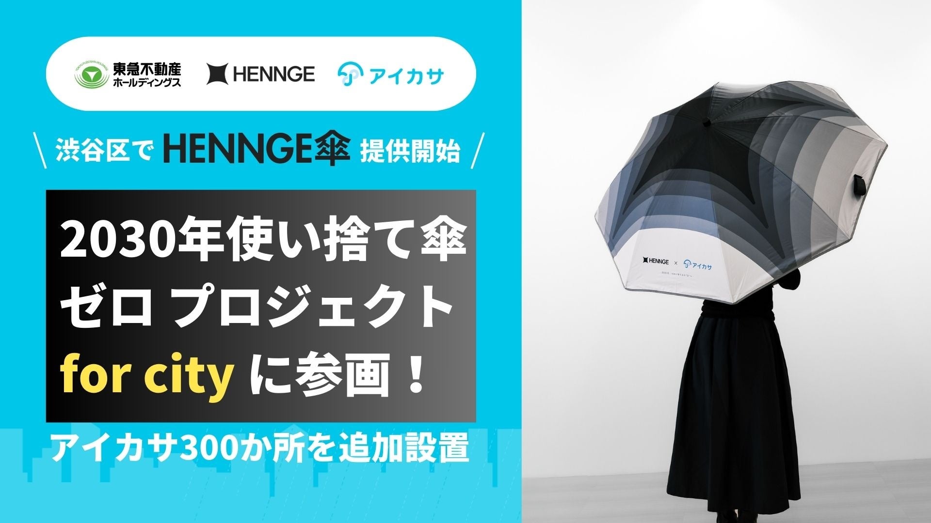 雨の日を快適にハッピーにする傘のシェアリングサービス「アイカサ」を運営する株式会社Nature Innovation Group(本社:東京都新宿区、代表取締役:丸川照司、以下アイカサ)は、「テクノロジーの解放で、世の中を変えていく。」を理念に、テクノロジーと現実間のギャップを埋める独自サービスを開発・販売しているHENNGE株式会社(本社:東京都渋谷区、代表取締役社長:小椋 一宏、以下、HENNGE)が、東急不動産HDとアイカサが行う「2030年使い捨て傘ゼロプロジェクト for city(渋谷)」(「傘のいらない街 渋谷」)に参画したことをお知らせします。