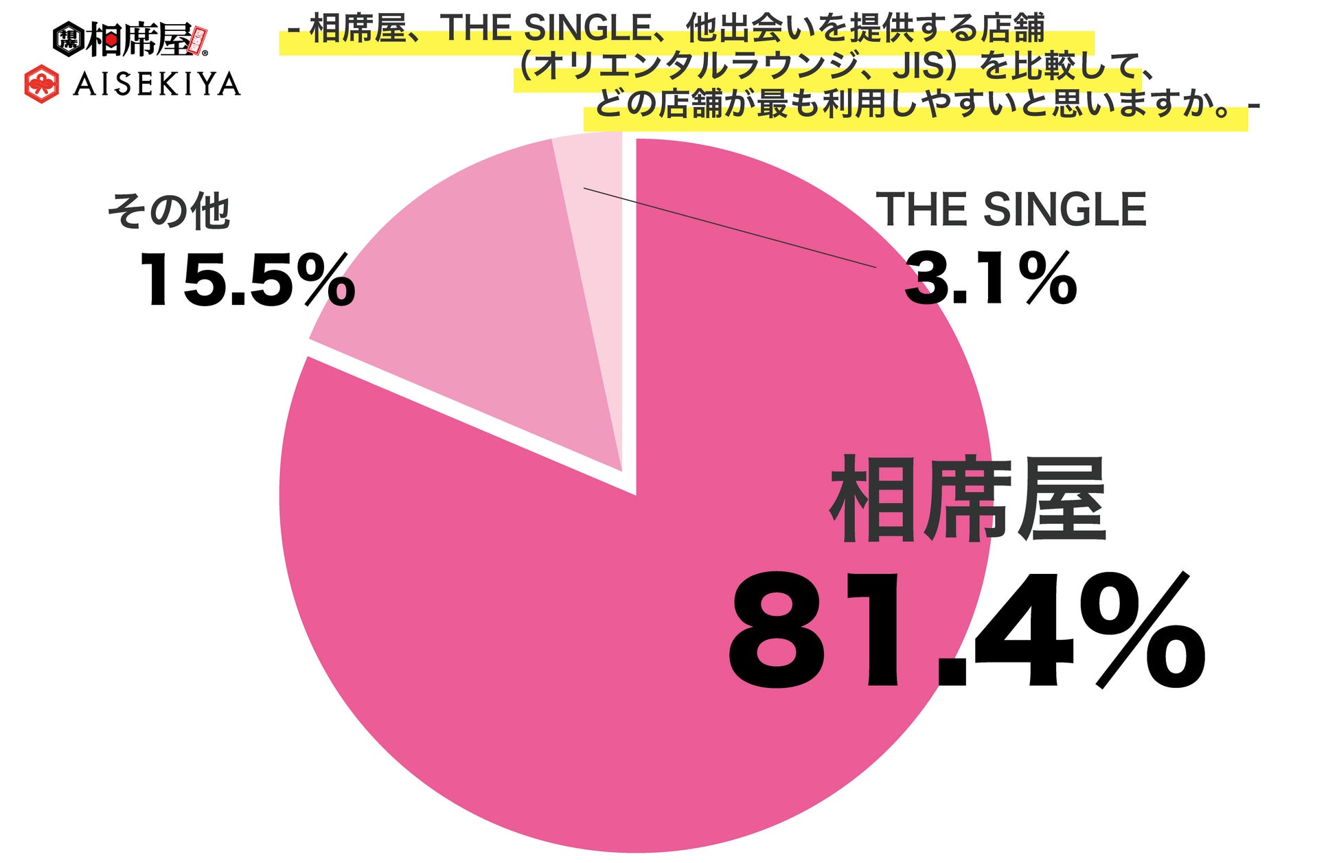 「相席屋、THE SINGLE、他出会いを提供する店舗(オリエンタルラウンジ、JIS)を比較して、どの店舗が最も利用しやすいと思いますか?」という質問に対し、81.4%が相席屋が最も利用しやすいと回答しました。