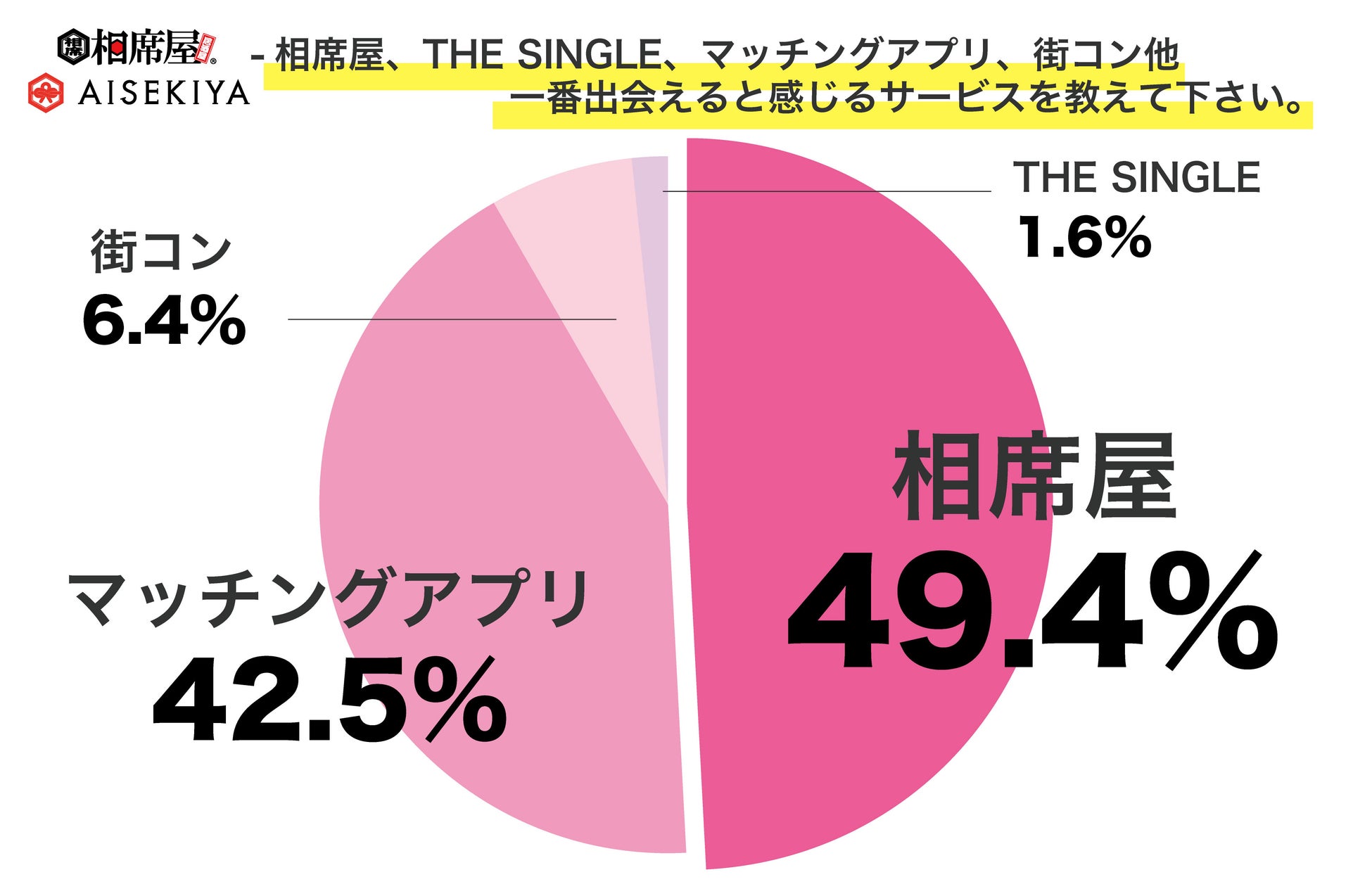 今回3,730名にアンケートを取った結果、「相席屋、THE SINGLE、マッチングアプリ、街コン他、一番出会えると感じるサービスを教えて下さい。」という質問に対し、相席屋が49.4%と最も多く、マッチングアプリや街コンをおさえて、気軽に出会える場所として大きく指示されている事がわかりました。