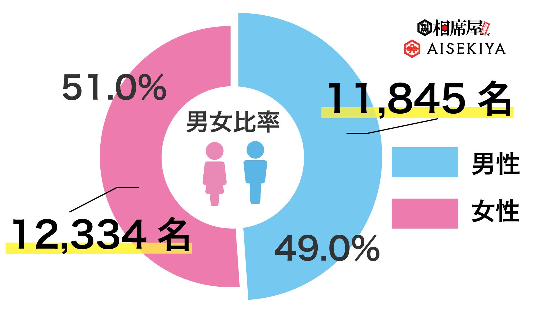 2023年9月の相席屋への男性来店数は11,845人、女性来店数は12,334人を突破。男性49.0%、女性51.0%でした。また、男性来店数のうち初めて来店した男性は3,940人、2回以上来店した男性は7,905人、女性来店数のうち初めて来店した女性は4,182人、2回以上来店した女性は8,152人でした。