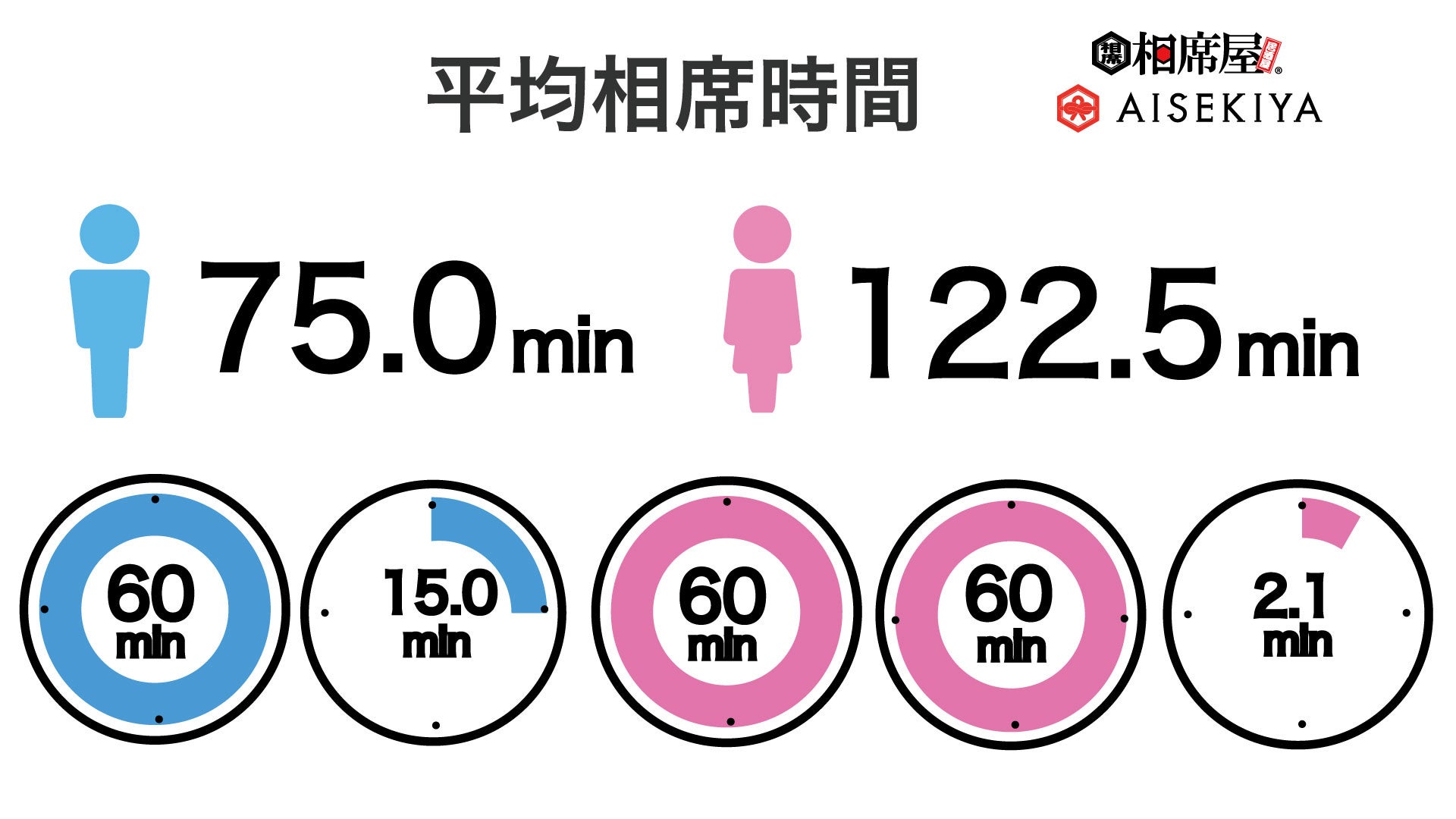 2023年9月の相席屋平均相席時間は男性は75.0分、女性は 122.5分となりました。