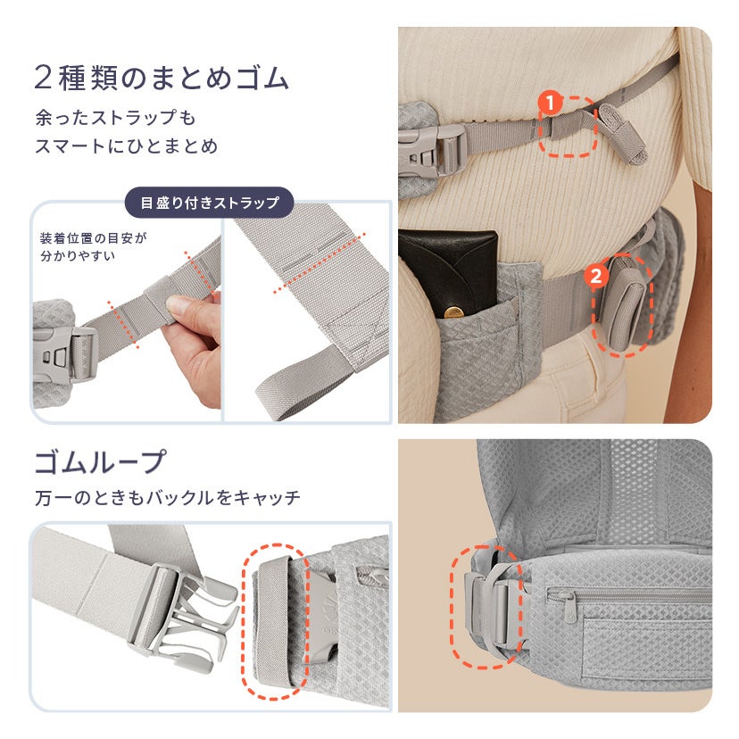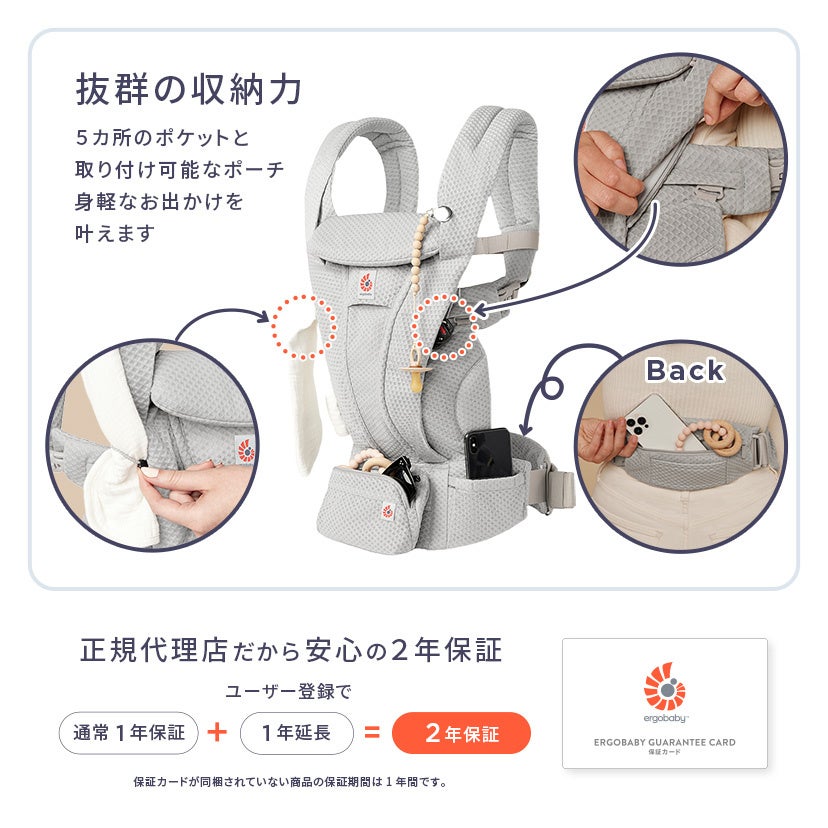 長年愛されるOMNIシリーズの特長である快適性をアップデート。抱っこひものある暮らしそのものもスマートに変える機能美が魅力です。また、メッシュを全面に使用し、表面のボタンやバックルを隠れる仕様にするなど、洗練された見た目になりました。