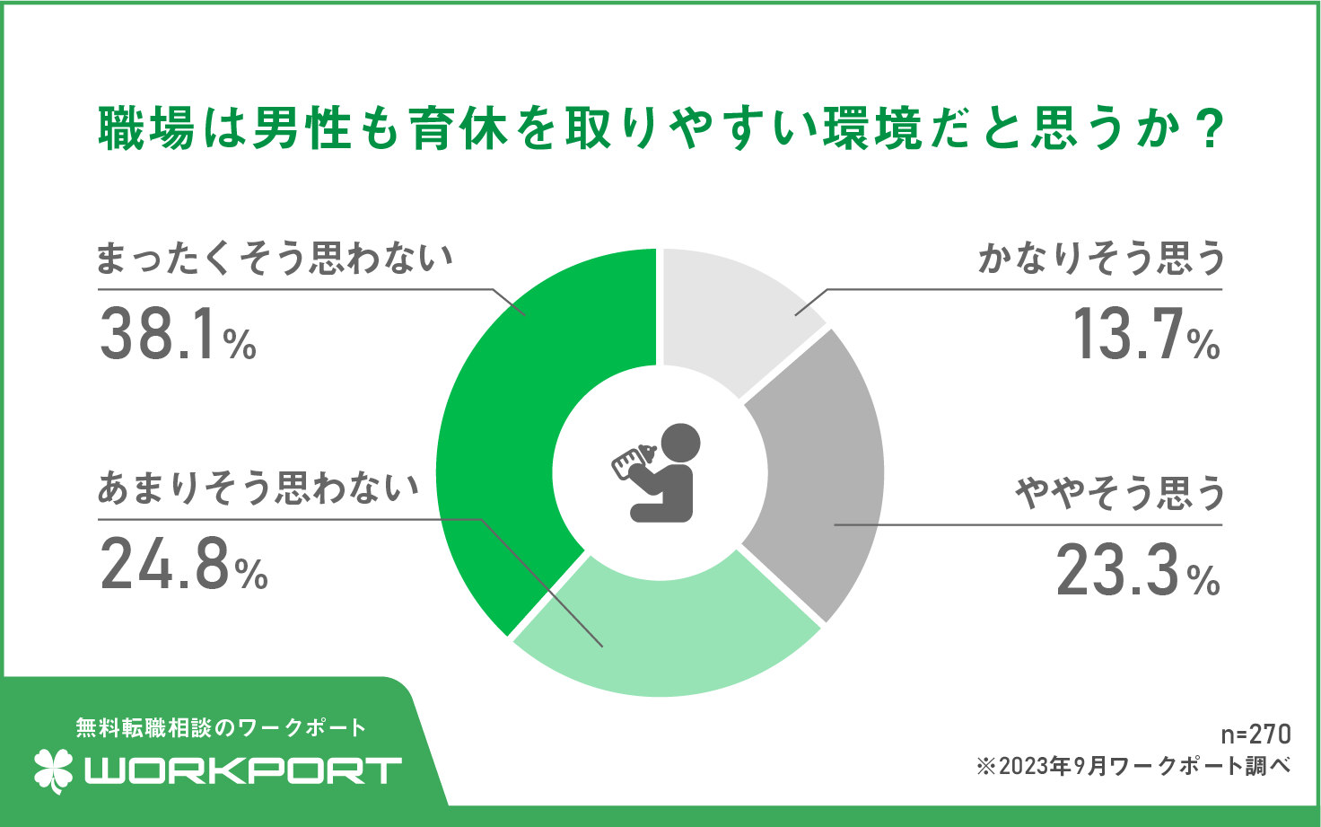 続いて、対象者全員に職場は男性も育休を取りやすい環境だと思うか聞いたところ、「まったくそう思わない」(38.1%)、「あまりそう思わない」(24.8%)が合わせて62.9%と半数を超えました。ちなみに1年前の調査では61.3%だったことから、産後パパ育休制度の施行から1年経った今も職場環境はあまり変化していないことが明らかになりました。