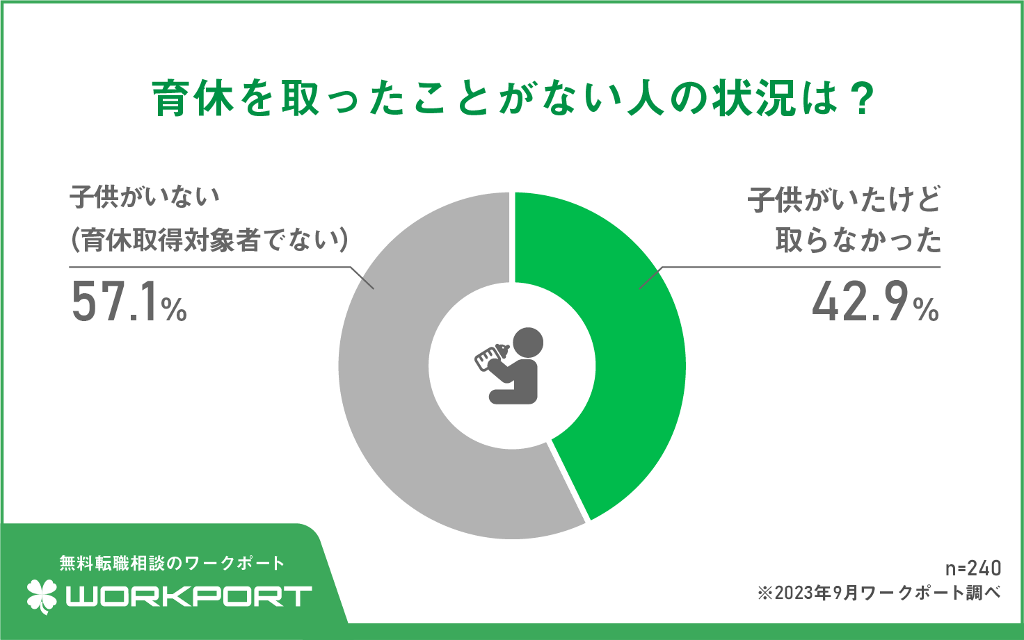 さらに、育休を取ったことがないとする男性に状況を聞いたところ、「子供がいたけど取らなかった」人が42.9%と半数近くにのぼりました。