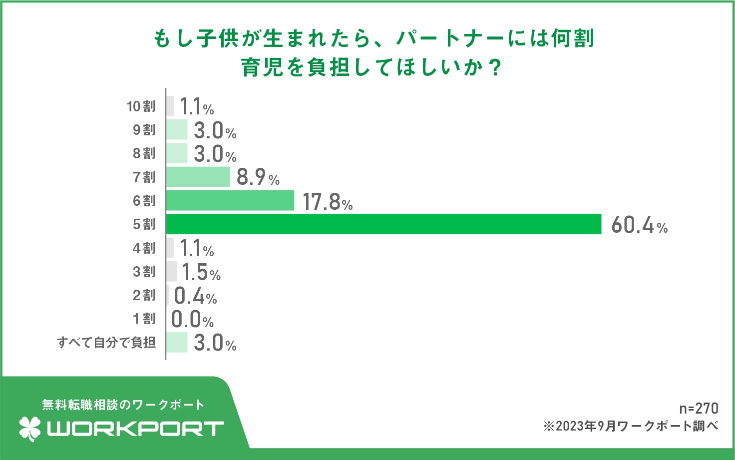 次に、対象者全員にもしご自身に子供が生まれた場合、パートナーには何割育児を負担してほしいか聞いたところ、「5割」と答えた男性が60.4%で最多となりました。前出の質問でも「育児は男女平等に」といった意見が多く挙がりましたが、育児の負担量についてもパートナーと半分ずつを理想とする人が多いことがわかりました。ただしその他の意見では、「6割」が17.8%、「7割」が8.9%と、パートナーにやや多めの負担を望む声が多い傾向にありました。