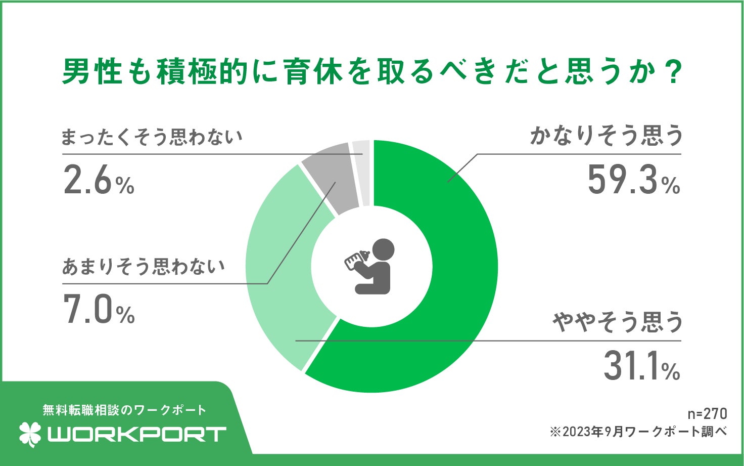 対象者全員に、男性も積極的に育休を取るべきだと思うか聞いたところ、「かなりそう思う」(59.3%)、「ややそう思う」(31.1%)が合わせて90.4%と9割を超えました。男性ビジネスパーソンの大部分が、男性も積極的に育休を取るべきという考えを持っているようです。