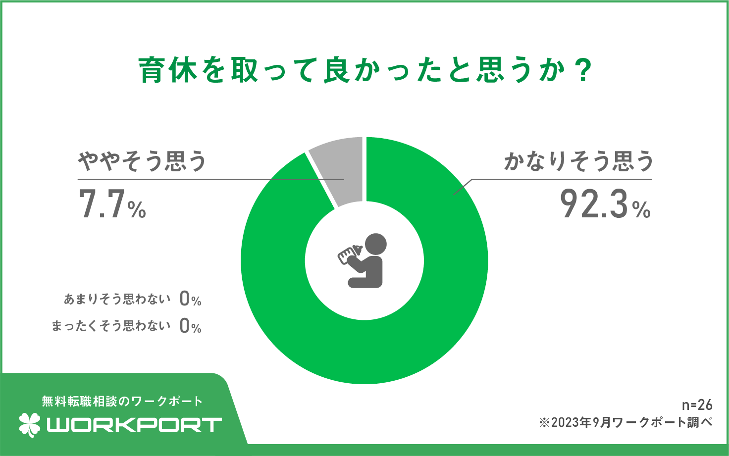 続いて、前出の回答者に育休を取って良かったと思うか聞いたところ、育休の取得経験がある男性の全員が「そう思う」と回答しました。さらに、そのうち約9割の人が「かなりそう思う」と強い満足感を示しました。