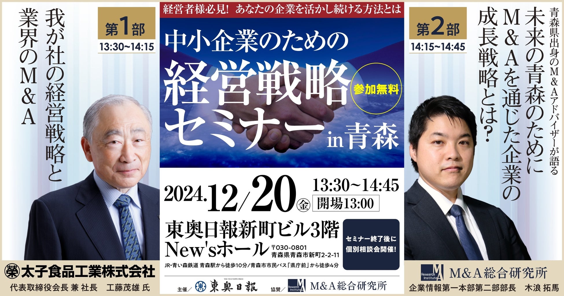 この度、青森県の中小企業の事業承継や成長戦略をテーマに、セミナーを実施させていただく運びとなりました。第一部は、太子食品工業株式会社 代表取締役会長 兼 社長 工藤茂雄氏より「我が社の経営戦略と業界のM&A」と題し、ご講演いただきます。 第二部は、株式会社M&A総合研究所 企業情報第一本部第二部 部長の木浪拓馬より「未来の青森のために M&Aを通じた企業の成長戦略とは?」と題してお話しいたします。